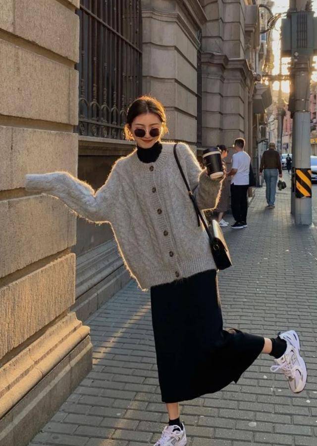 毛衣是营造氛围感的“利器”,配条直筒裙,温柔到骨子里,再用同色系袜子,拉长下身比例即可。