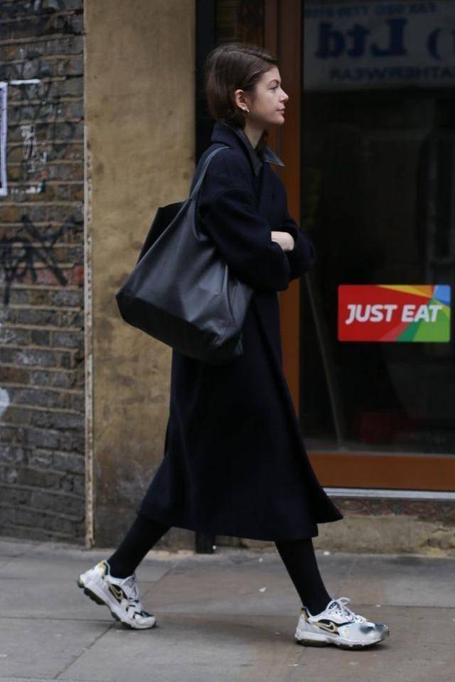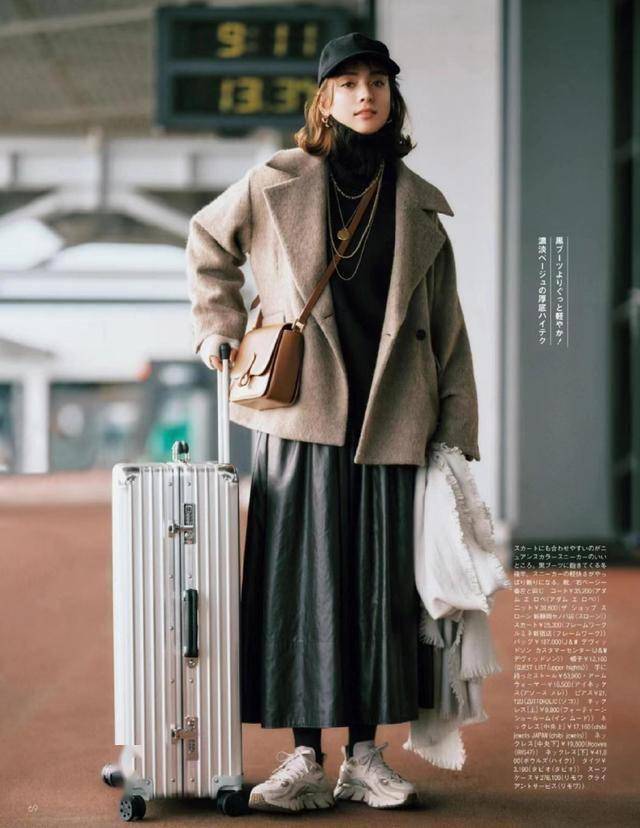 短大衣配皮裙,不仅能用靴子搭配,老爹鞋也是不出错的选项。