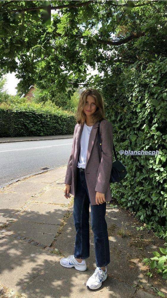 基础款的白色老爹鞋,配合上格纹西装,内搭白T恤+烟管裤,不管是日常逛街、喝下午茶还是通勤社交,皆可穿!