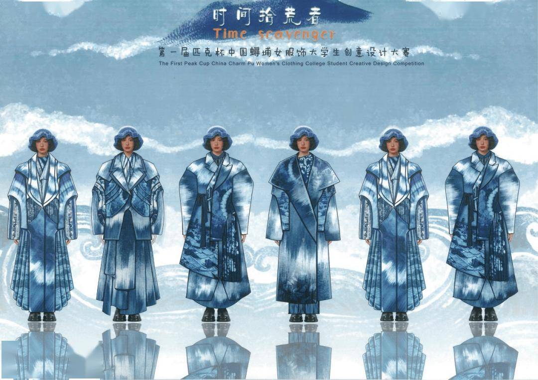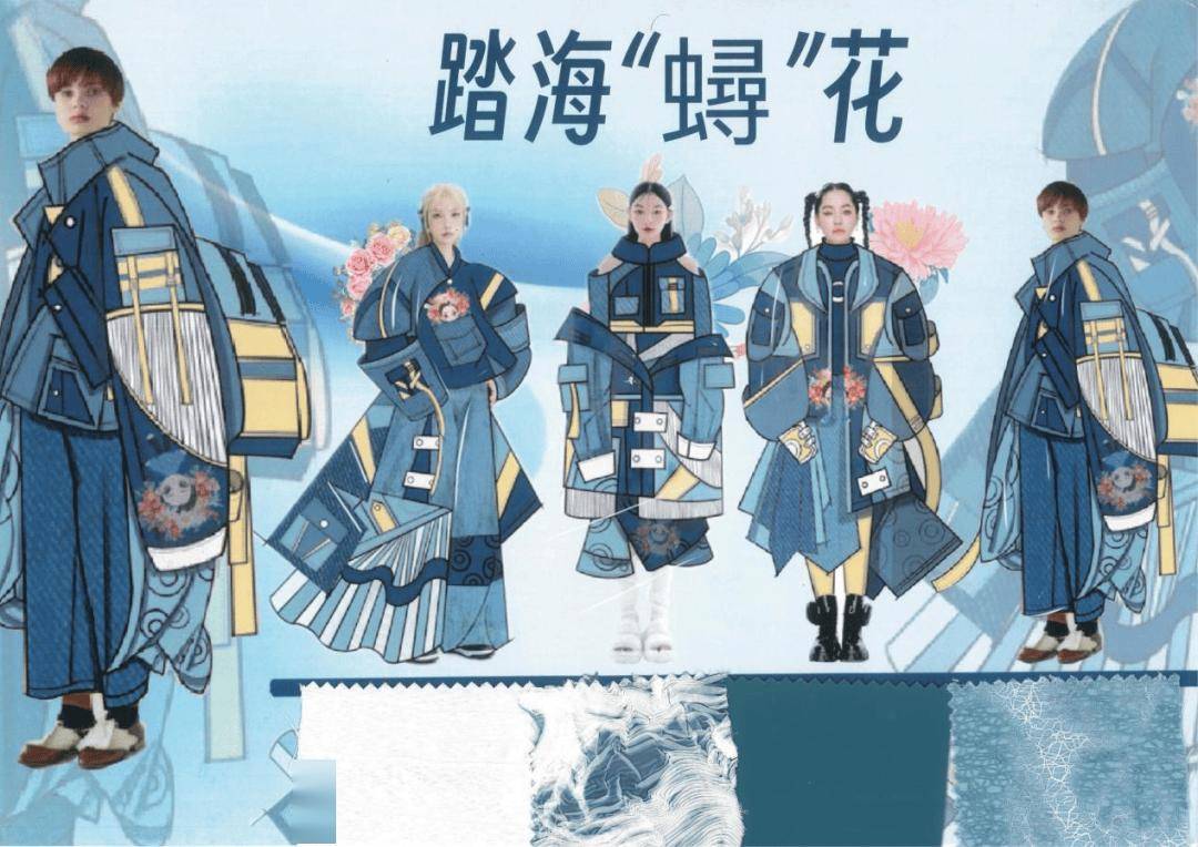 作品介绍:蟳埔女是福建三大渔女之一,“簪花围”,是蟳埔女服饰的一大亮点,被称为是“头顶的花园”。该系列设计选取大海为主题元素,用牛仔、蓝色功能性面料等来渲染蓝色的海洋,利用面料的褶皱原理来模仿蚵壳厝,以匹克的运动系列作为灵感来源,设计了此系列服装。