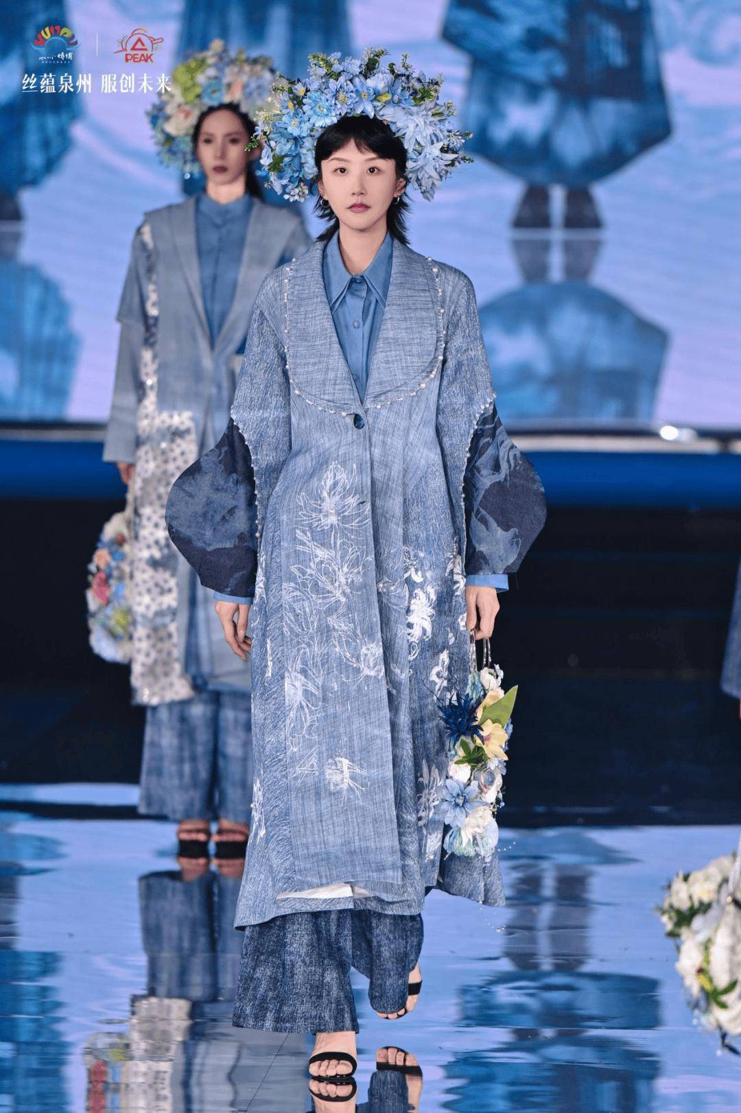 作品介绍:该系列的设计灵感来自蟳埔鱼港中斑驳的渔船和褪色的渔风。蟳埔文化不单纯是具象的鲜花,更多是海洋文化的烟火气息,更是丰收的喜悦和美好生活的赞颂。该组作品选用炒色牛仔、棉麻染色等多种面料,在现有面料基础上结合传统非遗蓝晒、植物染,拔印,拔染等手法进行面料二次改造设计。促进传统非遗工艺与现代设计手法的和谐融汇。结合了25秋冬流行趋势,色彩上采用大面积蓝色为本系列的主色调,用白色做点缀,经典的蓝白配色给人一种质朴、复古之感。休闲时尚风格的服装廓形进行改良,融合了传统非遗手工与现代设计相结合,结合工艺上采用了多层门襟的制作,解构的打破重组,渲染出了多层叠加类似鱼鳞的肌理效果,搭配立体石头浆印花如牡蛎壳,将蟳埔女及海洋文化更好地呈现出来。干净利落的剪裁,搭配钉珠,拔印、拔染、植物染等设计细节,营造出浪漫雅致的东方情调。解构大衣的创新演绎,展现了对东方美好的独到诠释。本系列服装在凸显蟳埔女文化中蕴含无穷魅力,创作中展现海洋文化特色,歌颂了蟳埔女勤劳能干的设计精神理念,也体现出泉州“融合民族文化多样性与包容性”的古城底蕴,绽放具有强烈特色的蟳埔女文化形象。