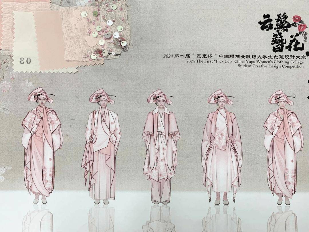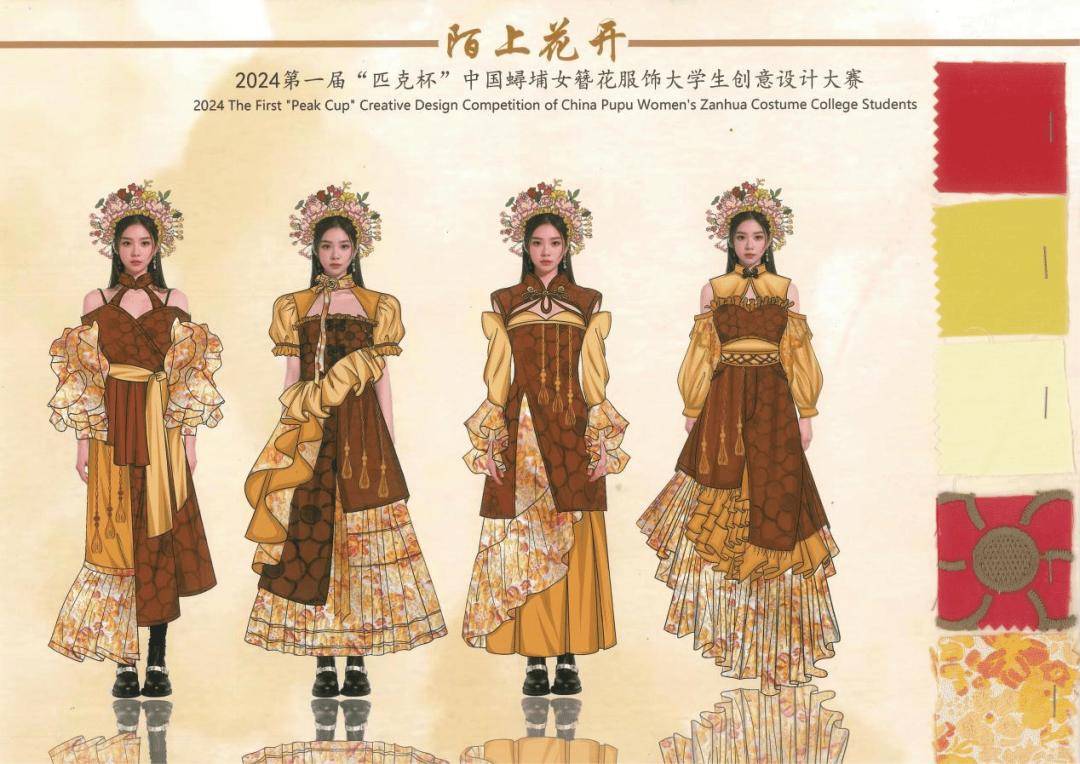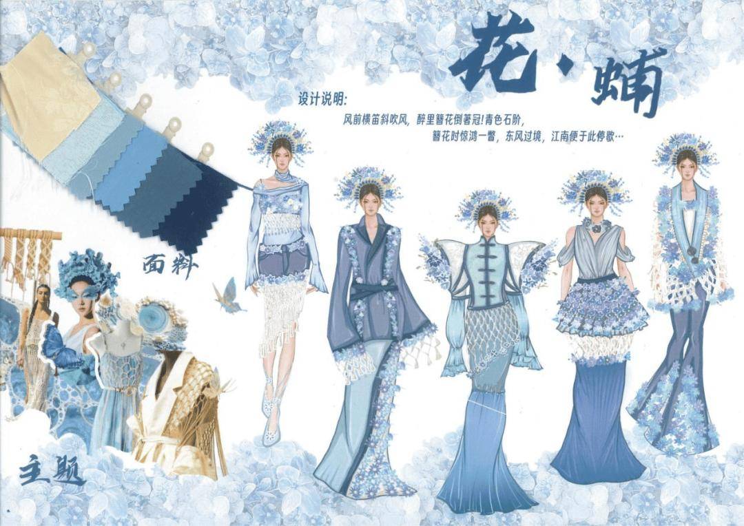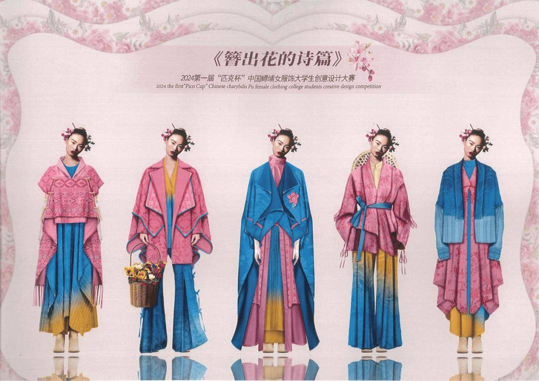 作品介绍:灵感来源于泉州这座历史悠久的文化名城的簪花艺术。色彩上深受当地文化影响,既鲜艳又和谐。多源自当地服饰,如粉红色、青花蓝等,色彩既彰显了地方特色,又体现了人们对生活的热情与期望。在工艺细节上,在服装上拼接的设计工艺,如同色系撞色、异质拼接等来与当地的服装相融合,在创新的基础上也保留了最传统的服装特点,皆在传承与发扬本民族特色。