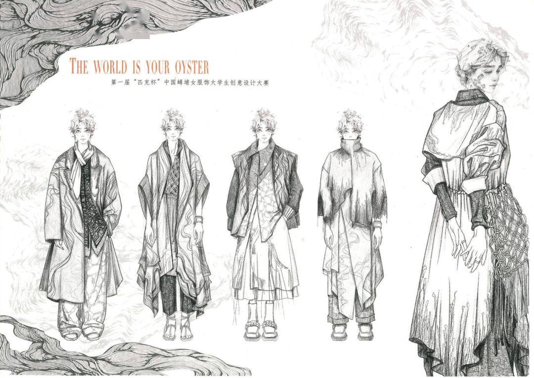 作品介绍:该系列作品的名字叫《the world is your oyster》,来自于莎士比亚戏剧《温莎的快乐夫人》中的一句台词“世界是我的牡蛎,我将以利剑开启。”想表达的是,一个人有无限的机会和可能性,关注自己,投入自己,最终方能抽丝剥茧,获得新生。在此次设计中,我选用牡蛎壳形象作为主要的图案设计,是因为蚵壳厝上的牡蛎壳为当地居民遮挡了百年风雨,具有十分特殊的意义。在设计中我保留了牡蛎壳层叠的效果与波浪线条,将其简化处理。廓形上主要以宽松舒适的居家款为主,结合天然纤维面料,以绳绣的方式来塑造层叠的立体感。色彩上以米白色为主,黑色与橙色作为点缀,橙色代表活力,以此来象征蟳埔女对生活的热爱。整个系列营造了一种向海而生的生命力。