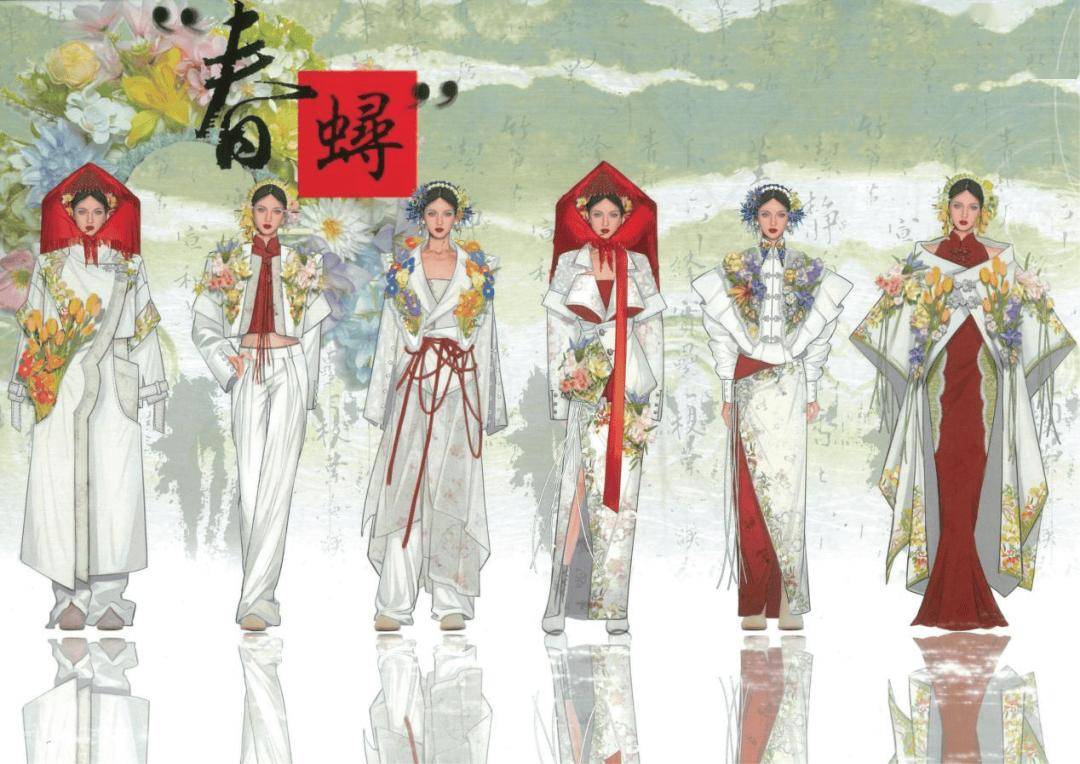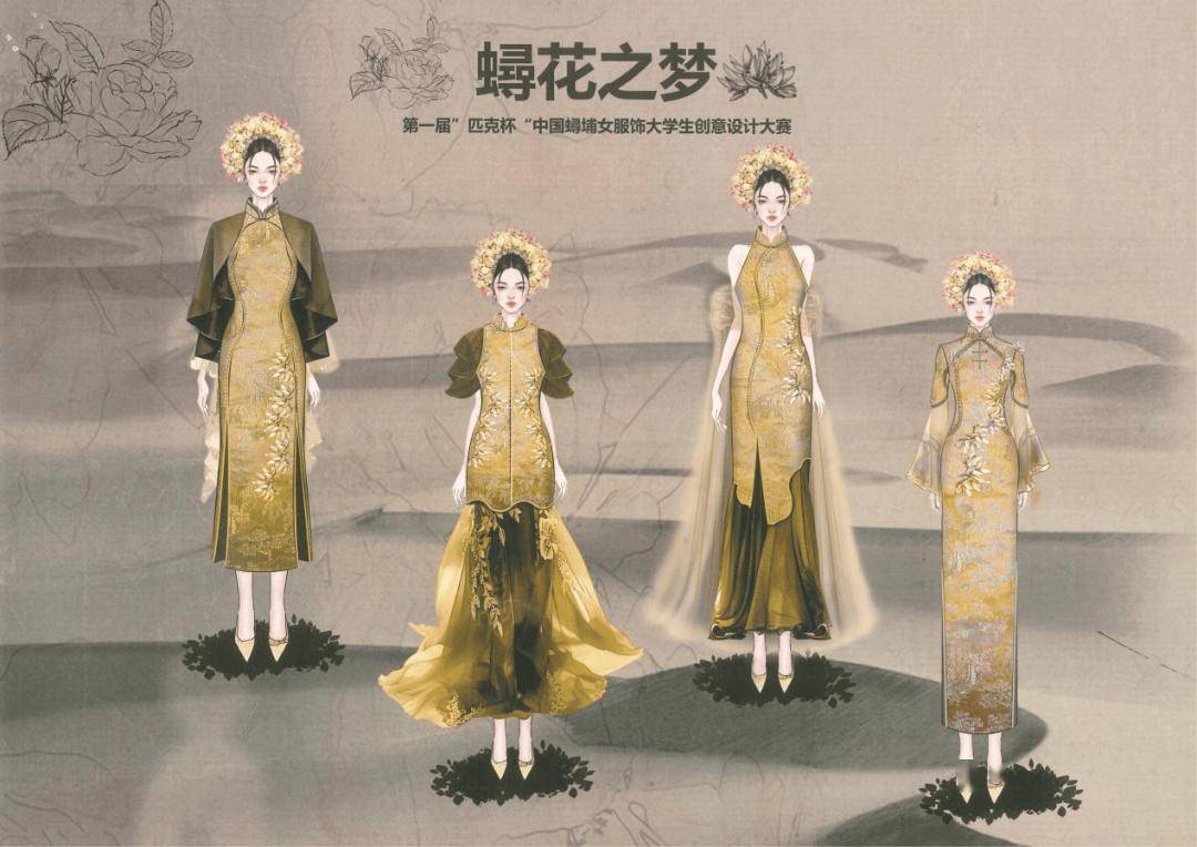作品介绍:本系列设计《蟳花之梦》灵感来源于福建泉州蟳埔女文化,采用泉州市花“刺桐花”元素作为刺绣工艺,整体设计以金黄色为主色调,工艺上也使用了包边条再镶嵌珍珠,使整体设计更为丰富,展现出女性的十足魅力,传统旗袍和现代旗袍的结合让设计更为时尚。