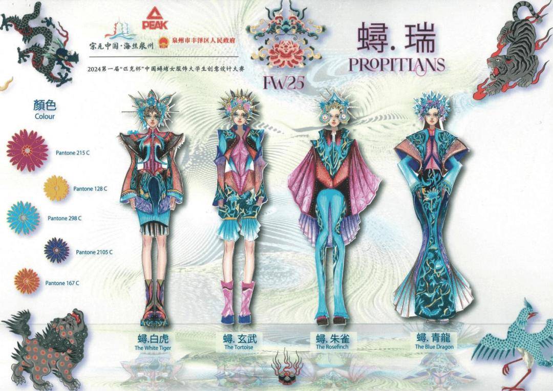 作品介绍:这个时装系列的设计概念结合了蟳埔女与四大神兽的元素。神兽丰富多彩的形态和鳞片与蟳埔女色彩纷至的刺绣和头饰很相似。再者,四大神兽有瑞兽之称,是寓意着吉祥的动物,是中国历史上最早的一种文化现象。每种服装都寓意着各种神兽,以及再设计的蟳埔女头饰,加上神兽金光璀璨的特征。在颜色上,运用了鲜艳的颜色,寓意着美好吉祥,神圣及庄严的意思,希望这个设计的融合可以令各界关注蟳埔女的文化。