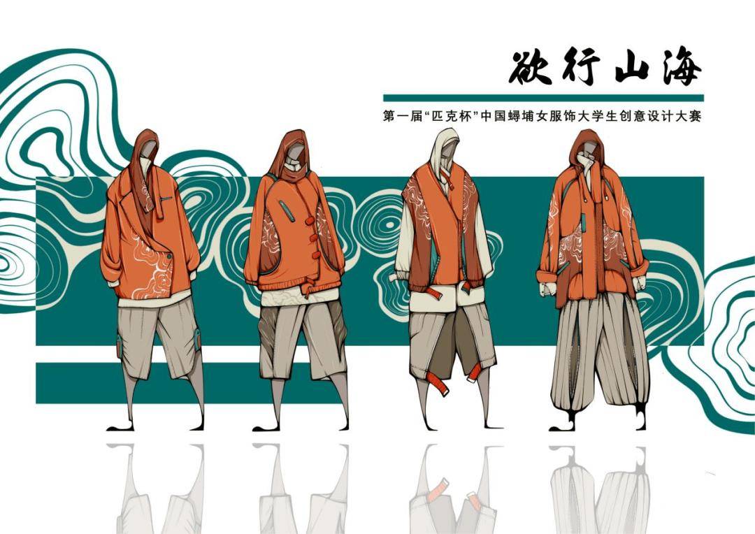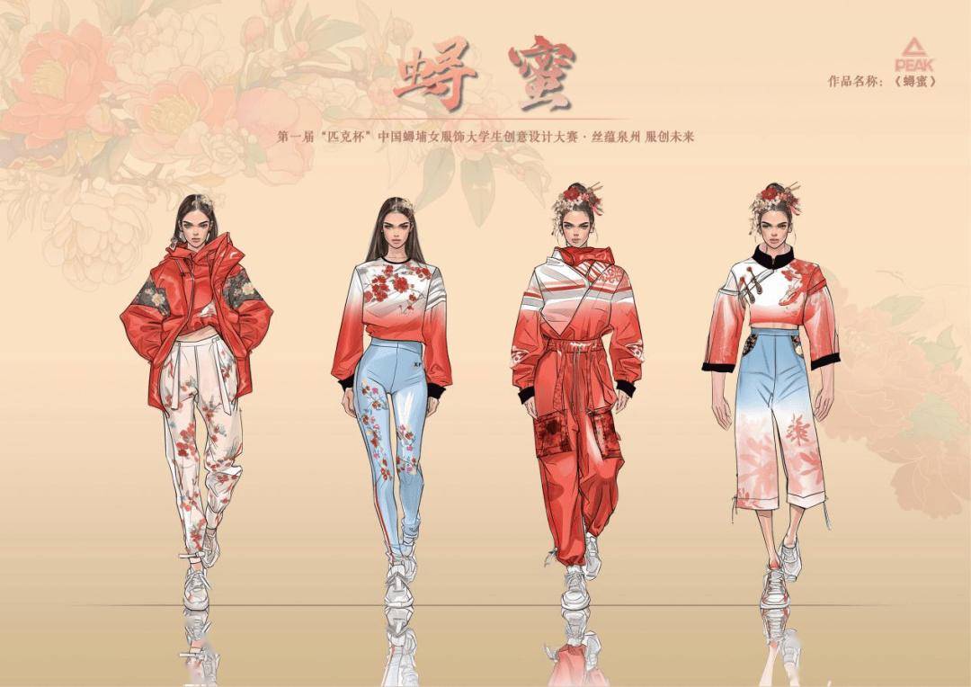 作品介绍:以蟳埔女服饰做为服装设计灵感,结合泉州市市花,服装颜色以传统服饰和当下趋势结合。红白为主,风格为国潮,轻运动,休闲简约。功能防水,可拆卸,收纳,透气。