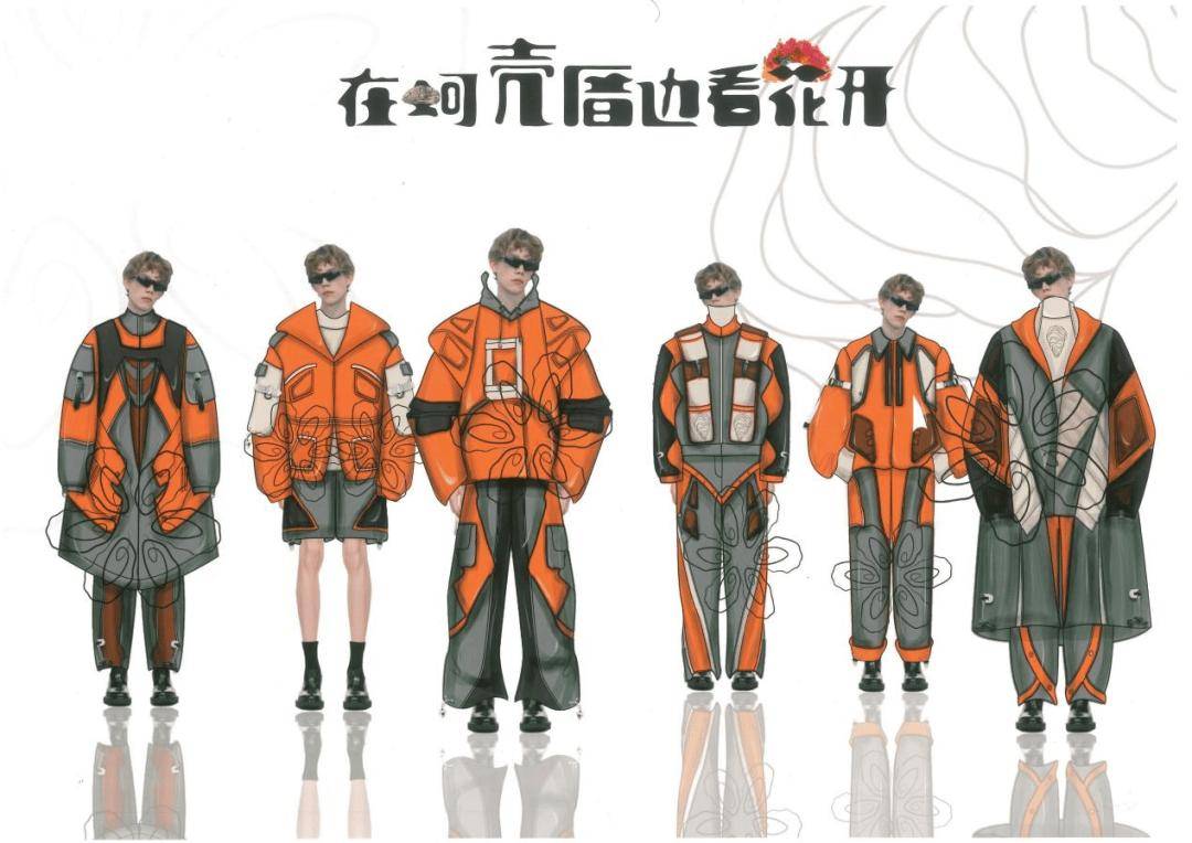 作品介绍:本系列灵感来源于蟳埔女文化元素,设计出现代多功能户外男装。泉州是古代海上丝绸之路的起点,从中提取海洋元素,如簪花围、海浪、牡蛎壳、帆船、蚵壳厝等作为设计元素。将此元素抽象化后应用到服装的线条和款式设计上。