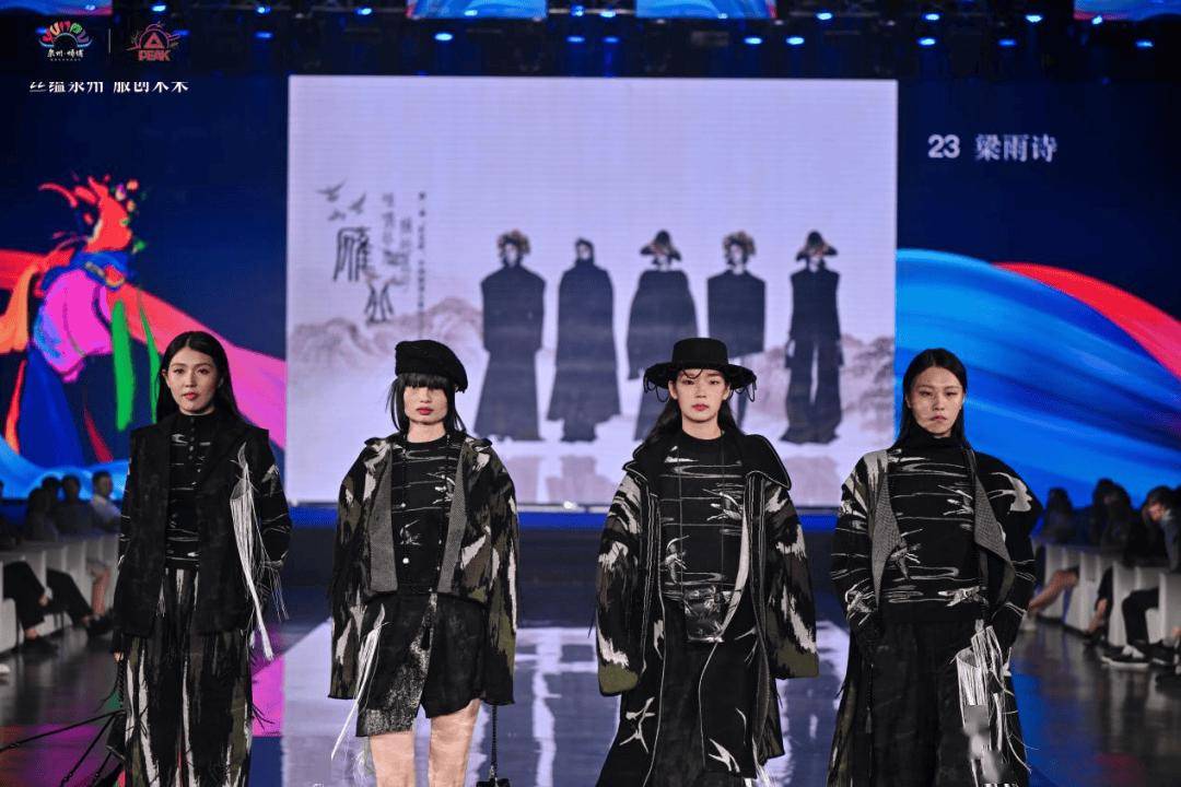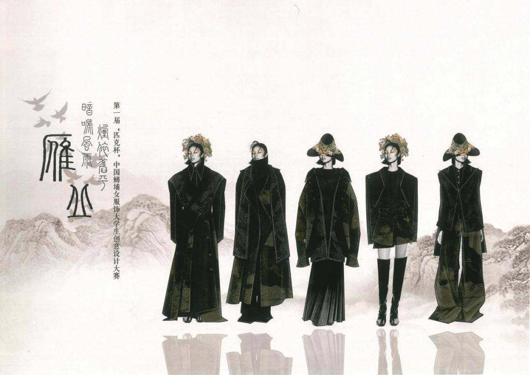 作品介绍:作品灵感源于《雁丘词》。以新中式休闲服装为载体,通过针织与色彩展现中国传统美(针织纹样是抽象概括出的泉州层叠的山和弯曲的河,以及大雁祥云图案;色彩从中国画中提取,有石灰、青绿、土黄、墨黑等)。制作工艺主要是针织提花+手缝珠串;成衣面料均为提花(烫金)面料+刺绣和流苏。