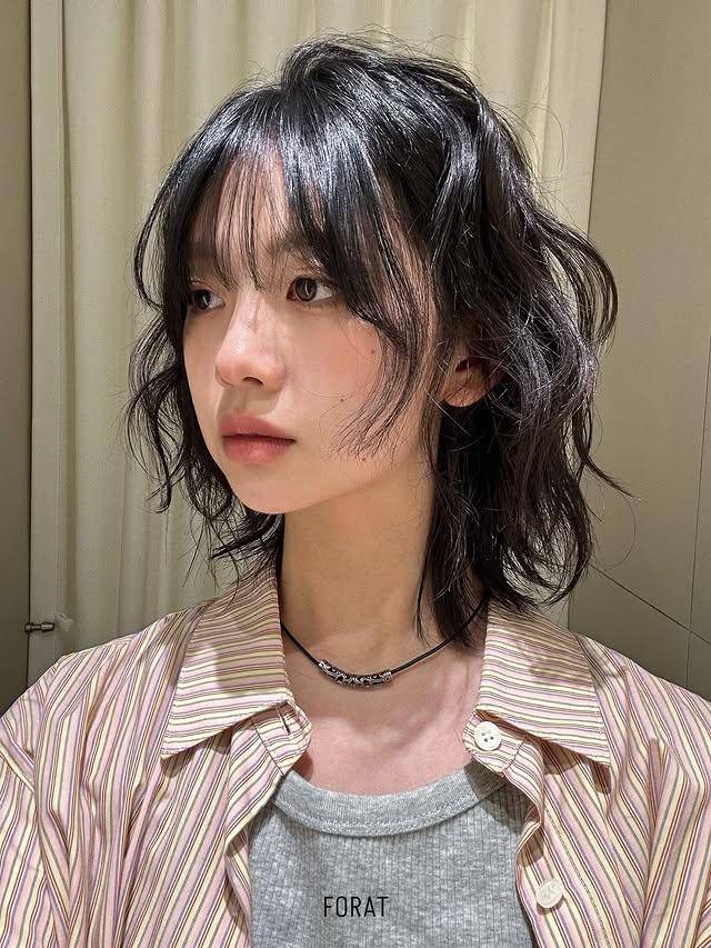 锁骨附近的长度打造前短后长的鲻鱼头轮廓,羊毛卷的纹理让发尾自带灵动弧度,既保留了鲻鱼头的酷感叛逆,又因卷发的柔和弱化了攻击性。
