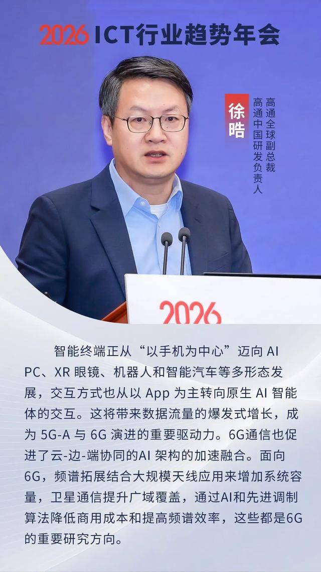 高通中国研发负责人徐晧指出,6G的发展将由AI驱动,以智能体为核心交互方式,并依赖更大带宽与大规模天线技术来支撑流量增长,预计2028年将迎来6G预商用设备。
