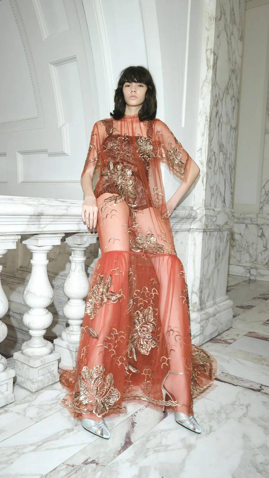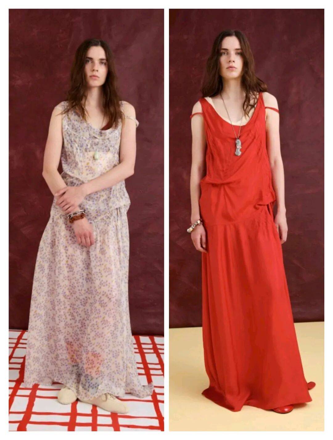 在无袖吊带裙装的款式上,吊带的款式结合了一些褶皱的元素增加了一些立体细节的造型,而优雅的裙装也在不对称设计、轻薄薄纱等设计之上,让优雅裙装也有不少细节的时髦感。