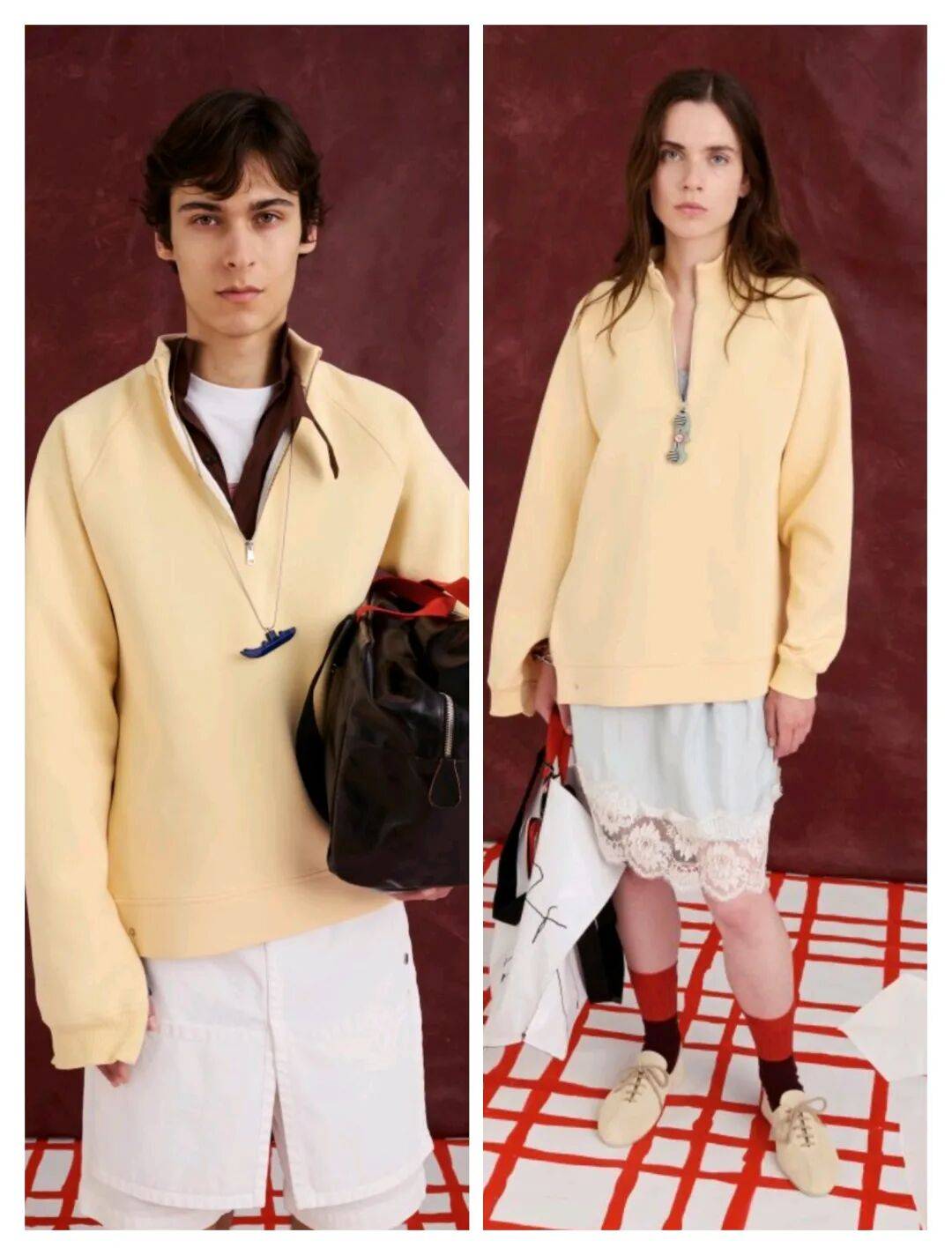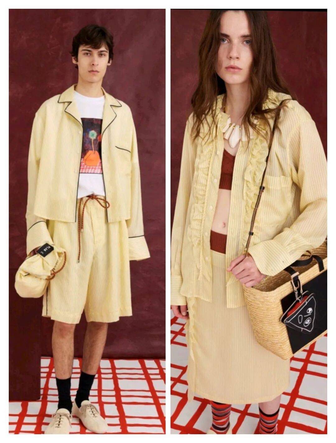 暗红色颜色在鲜艳中也多了稳重的沉稳气质,服装在宽松廓形的线条上,休闲随性,而浅色的颜色在撞色中增加了一些线条的修饰感,在视觉上打造了一些睡衣的视觉效果。