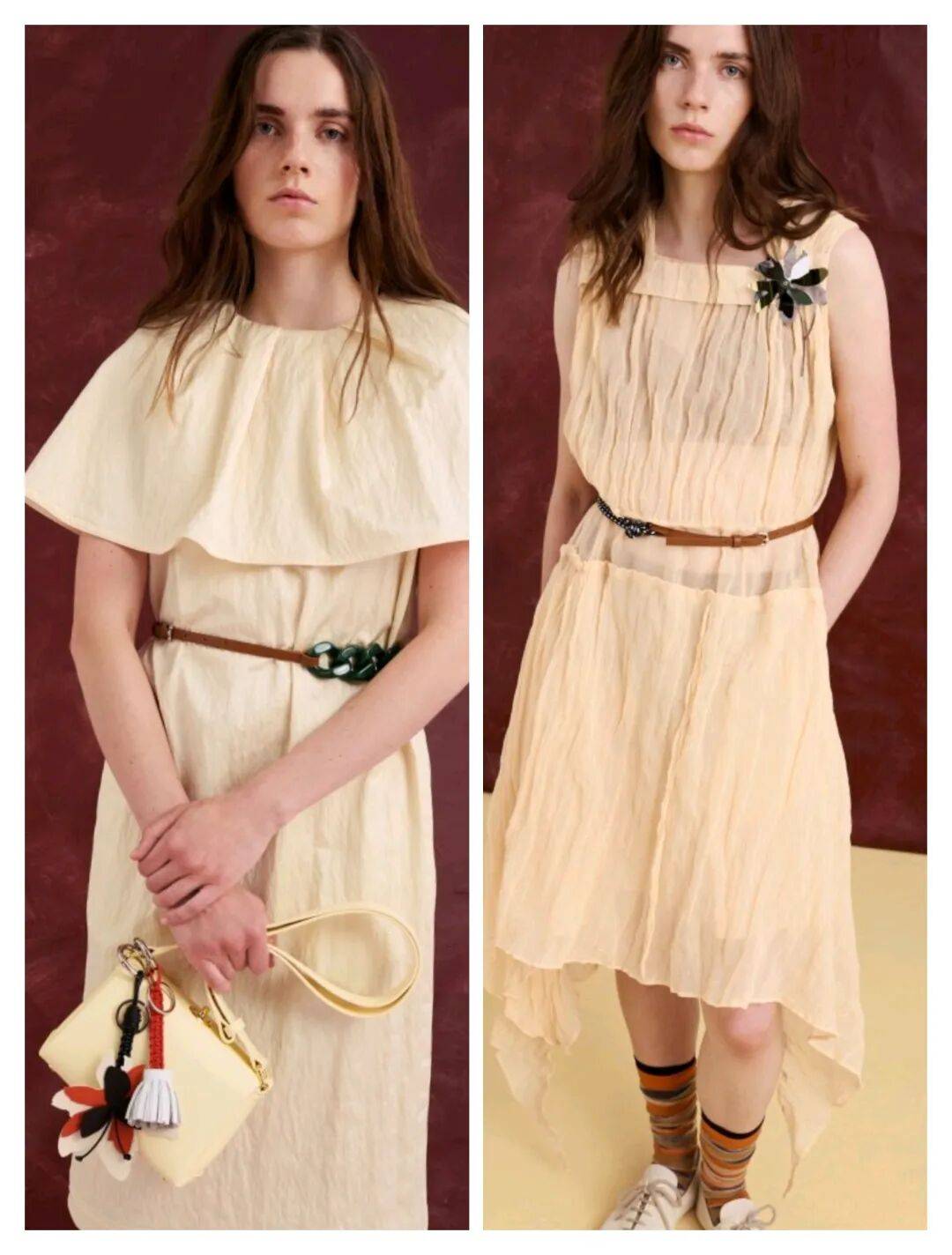在低调的暖白色颜色中,朴素柔和也多了几分温暖的气质,而纯色的简约还在裙装的简约优雅中,还在裙摆以不规则的造型多了线条感,结合面料的褶皱纹理、拼接荷叶边的斗篷元素、撞色腰带等设计的结合,则让浅色的裙装多了不少的时尚细节。