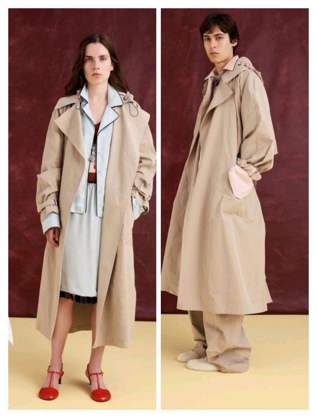 还在和浅色休闲套装、红色鞋子等之间的搭配,在这些不同色彩之间的对比中,让卡其色风衣外套穿出 了更多时髦的气质。
