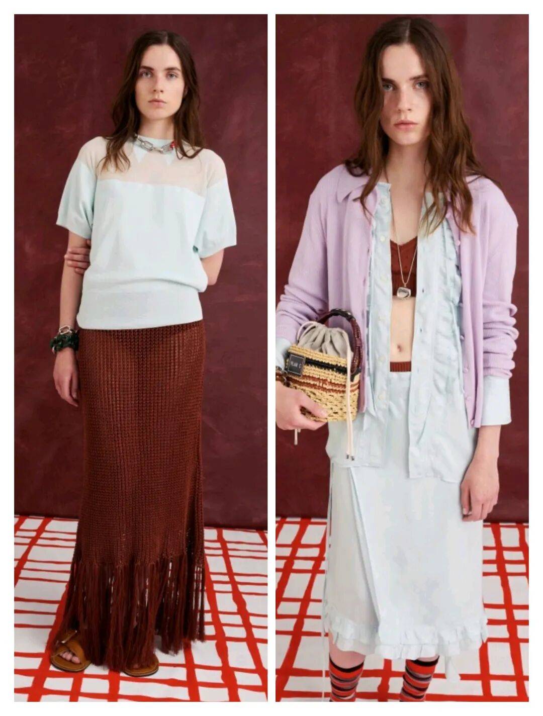 红棕色颜色和浅色系的白蓝色的结合搭配,色彩之间的撞色冲击感较为强烈,在这些色彩的对比中,清新优雅也更有一些气质感,结合流苏、编织纹理、拼接荷叶边等设计的结合,则多了不少细节的亮点时尚。