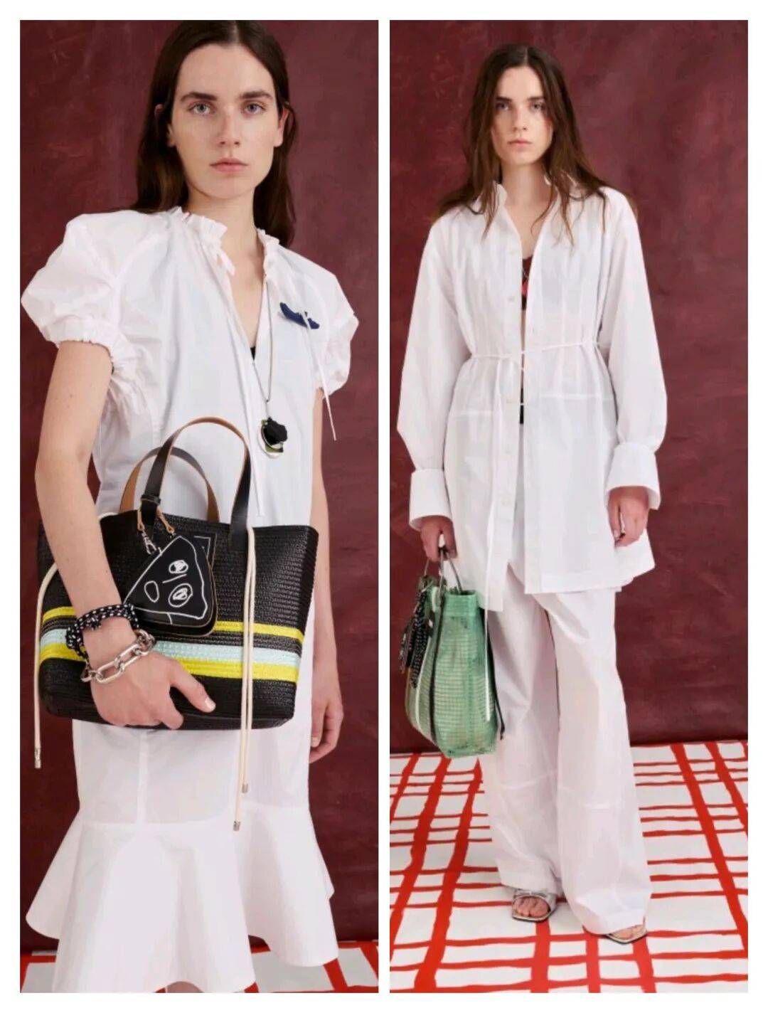 白色颜色为主的服装还在拼接的线条、造型感袖子、收腰腰带、拼接鱼尾下摆等设计的结合,还让白色的服装有着一些细节的时尚感;还在彩色包包的搭配,视觉的对比也打造了一些细节亮点的装饰。