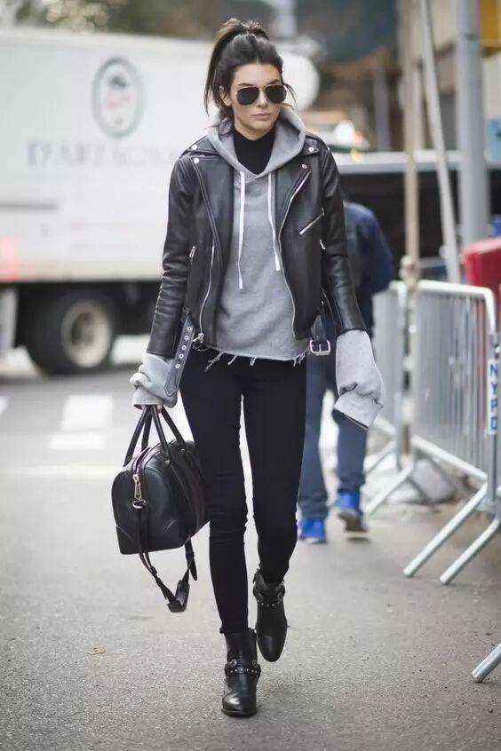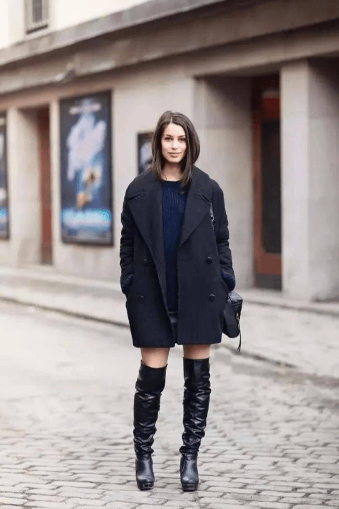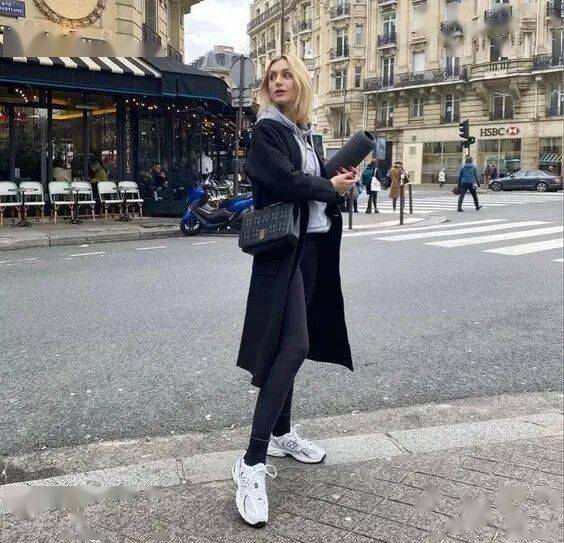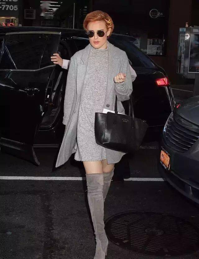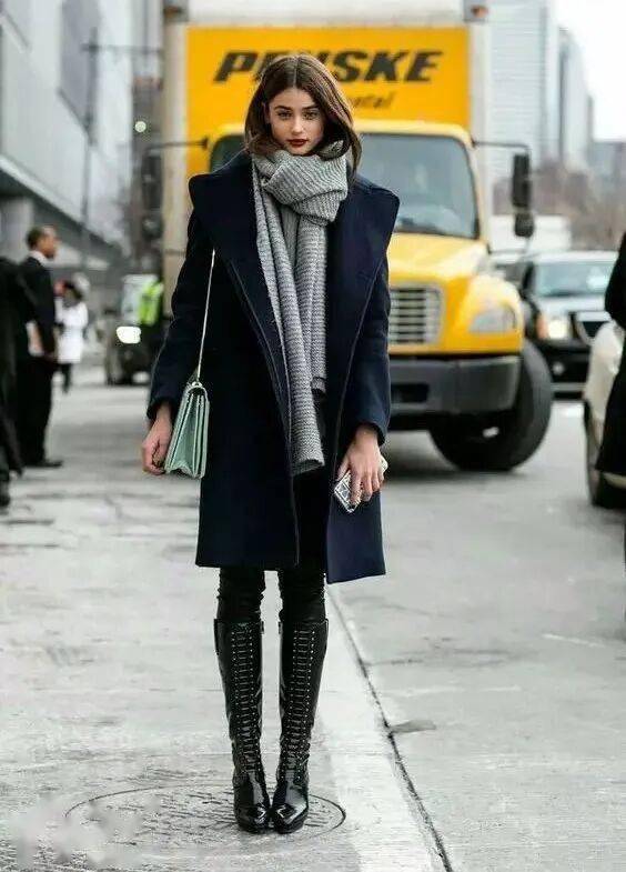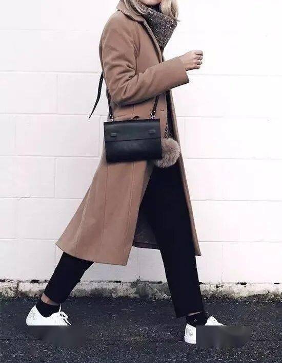 经典组合:灰色大衣+白色高领针织+深灰直筒裙,用金色耳环或亮色手袋提亮。
