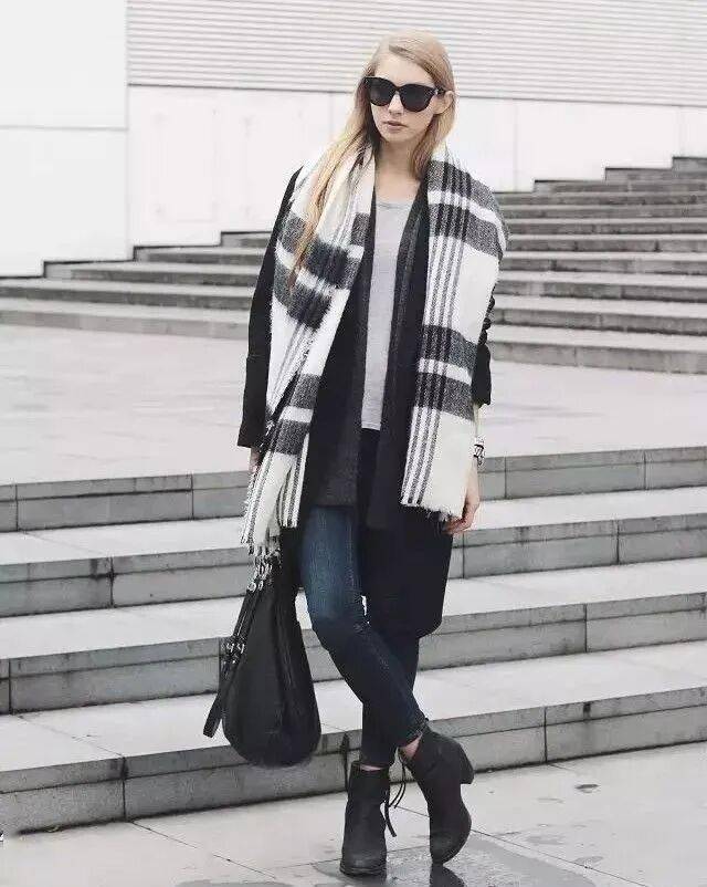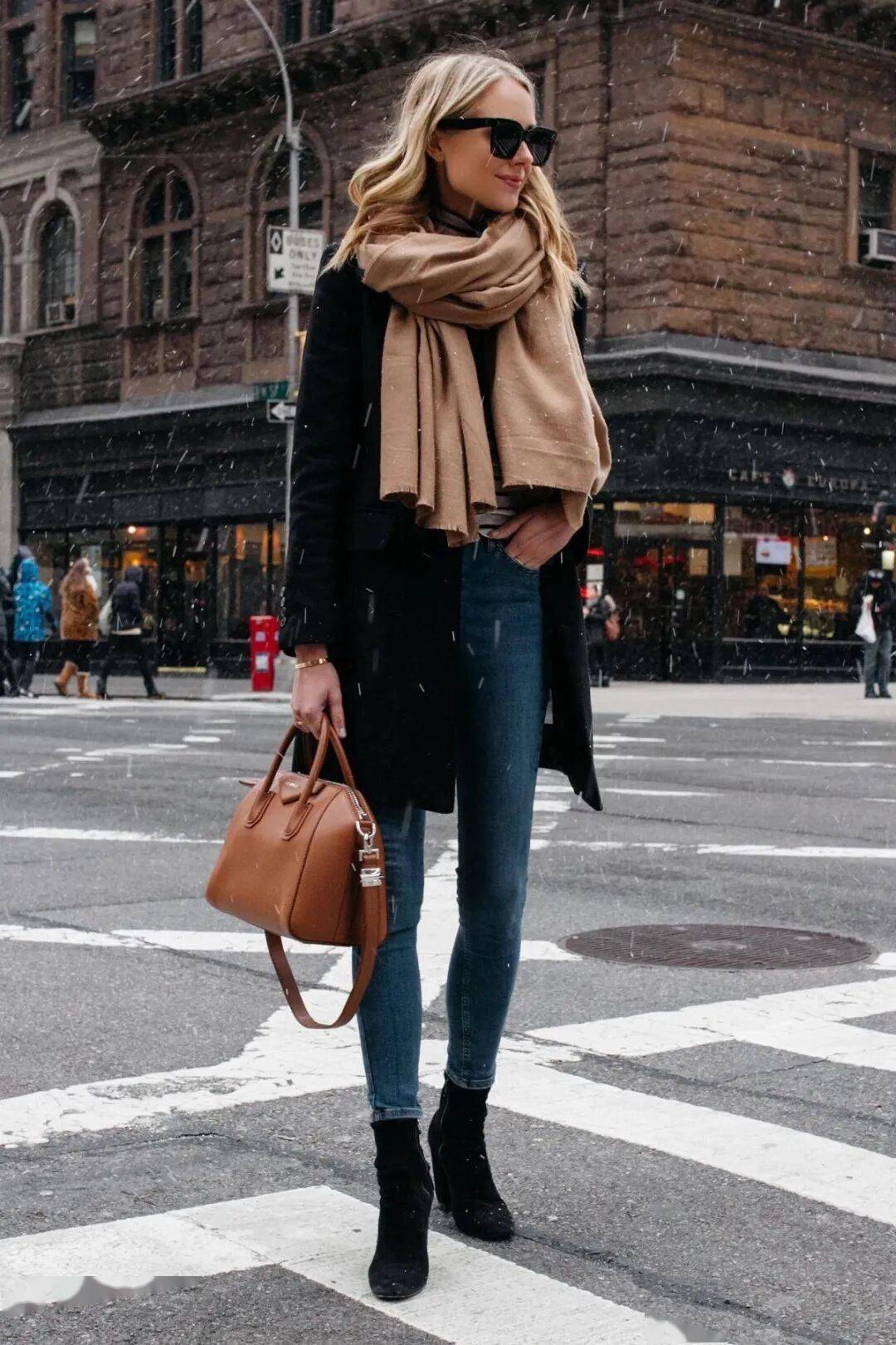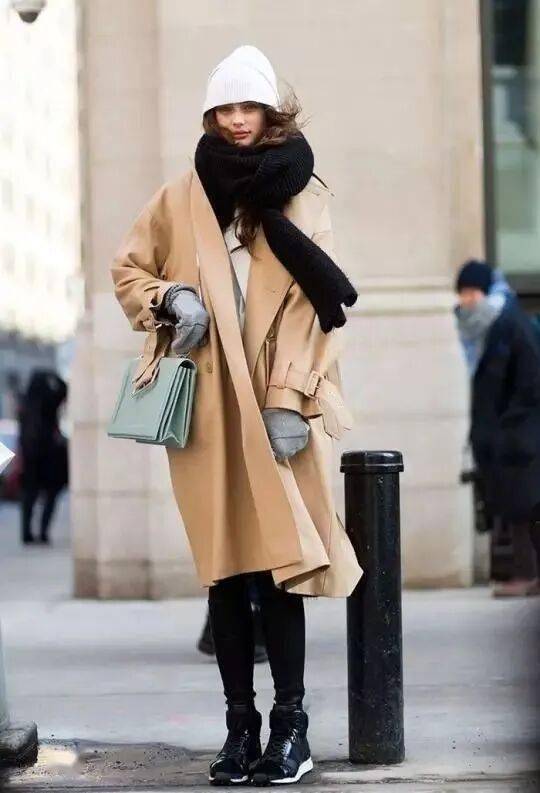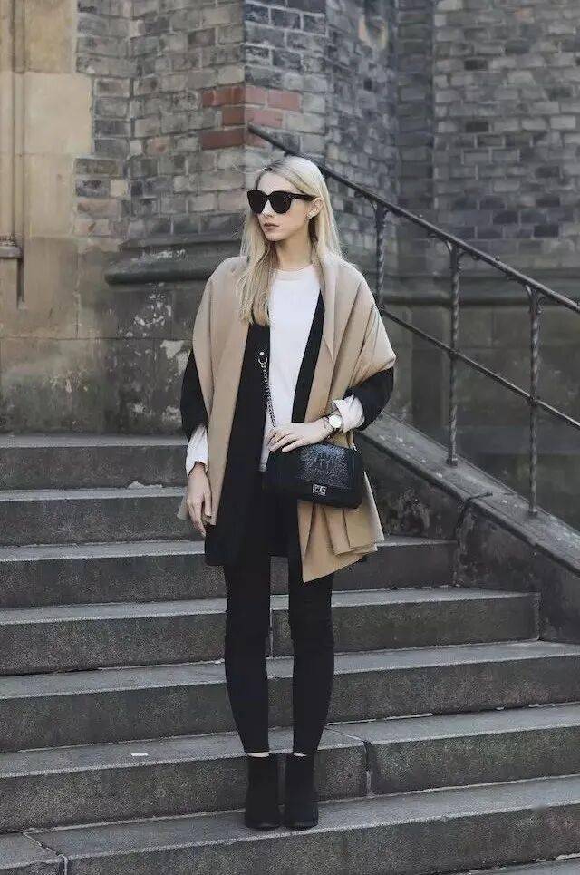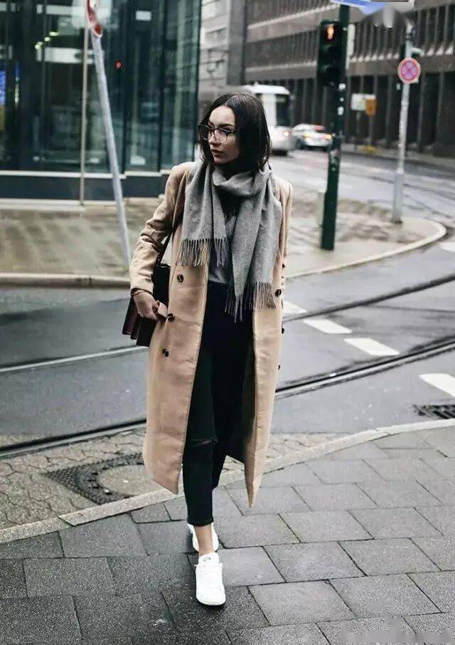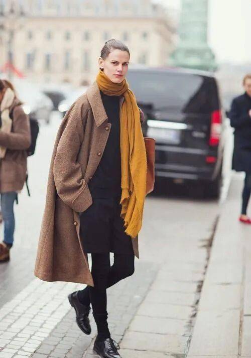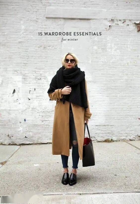 围巾领大衣:羊绒材质+宽松剪裁,通过围巾系法变换风格。