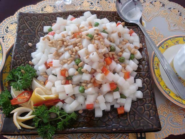 材料:鲜山药500克,油炸松仁50克,青豆、红椒各25克。味精3克,盐4克,糖10克,白醋20克,花生油30克,湿淀粉6克。