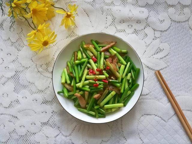 材料:蒜苔、盐、油、生抽、香辣酱、香油、醋