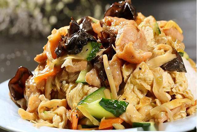 5、锅留余油,将肉丝放入煸炒,肉色变白后,加入葱、姜丝同炒,至八成熟时,加入料酒、酱油、盐,炒匀后加入木耳、黄瓜、胡萝卜和鸡蛋块同炒,熟后淋入香油即可。