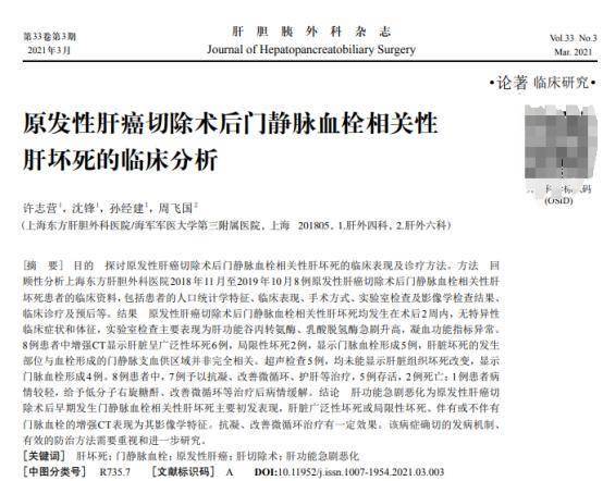 [1] 原发性肝癌切除术后门静脉血栓相关性肝坏死的临床分析 许志营;沈锋;孙经建;周飞国 肝胆胰外科杂志 2021-03-15