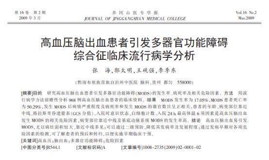 [1] 张海.高血压脑出血患者引发多器官功能障碍综合征临床流行病学分析, 井冈山医专学报 ,2009-03-20
