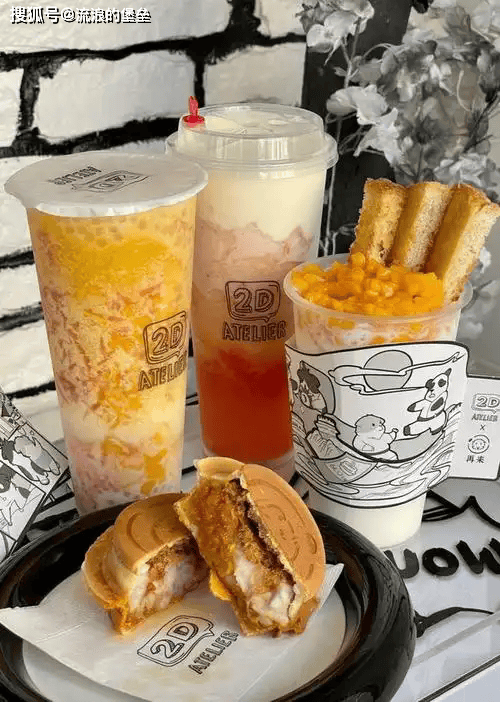 图片3:展示两杯饮品(一杯黄色碎冰饮料、一杯红白分层饮品),还有一杯含黄色颗粒和面包条的食物,均标有“2D ATELIER”字样,明显为网红甜品店出品。