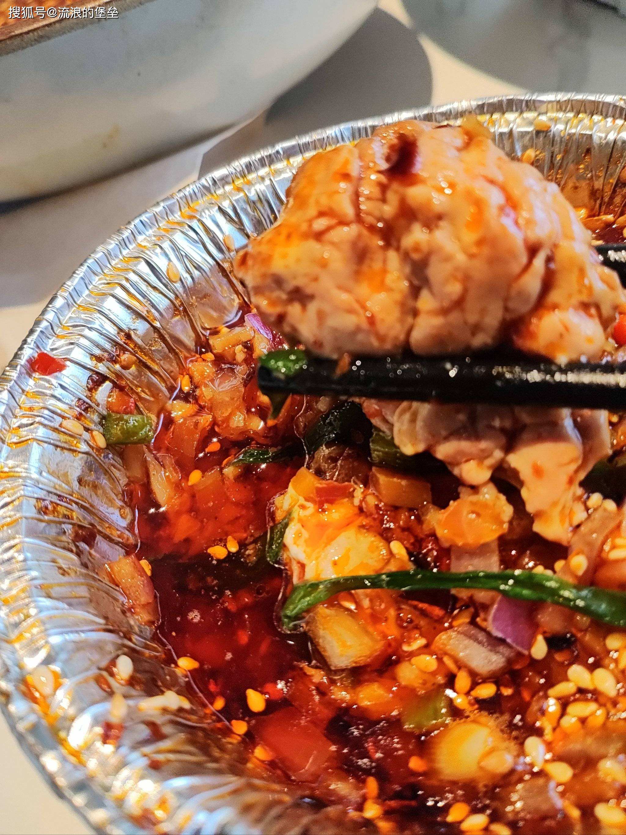 图片2:清晰显示了一碗铝箔碗中的食物,其中有一块被筷子夹起的脑花,搭配红油汤底、葱段、洋葱、芝麻等配料。