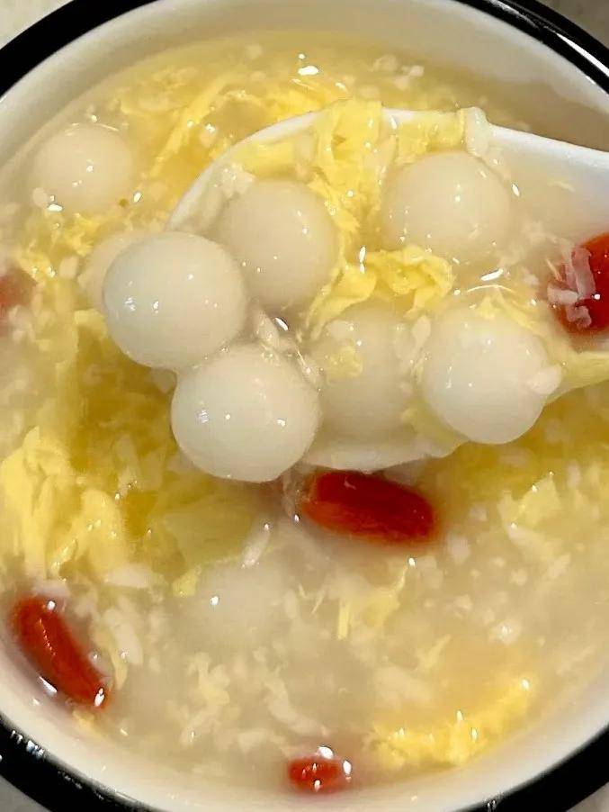 图片4中有一碗白色小球状物+黄色蛋花+枸杞的汤品,很可能就是一道典型的醪糟鸡蛋汤。