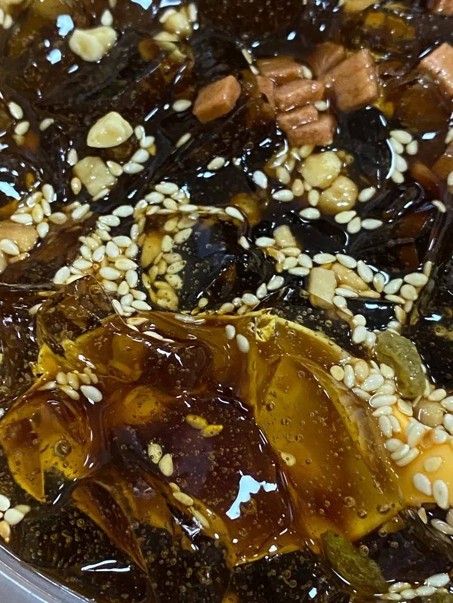 图7中的“透明或深色胶状物质+芝麻+葡萄干”组合,极像是改良版冰粉或凉粉,若在国外展出,完全可能被称为“水信玄饼”。
