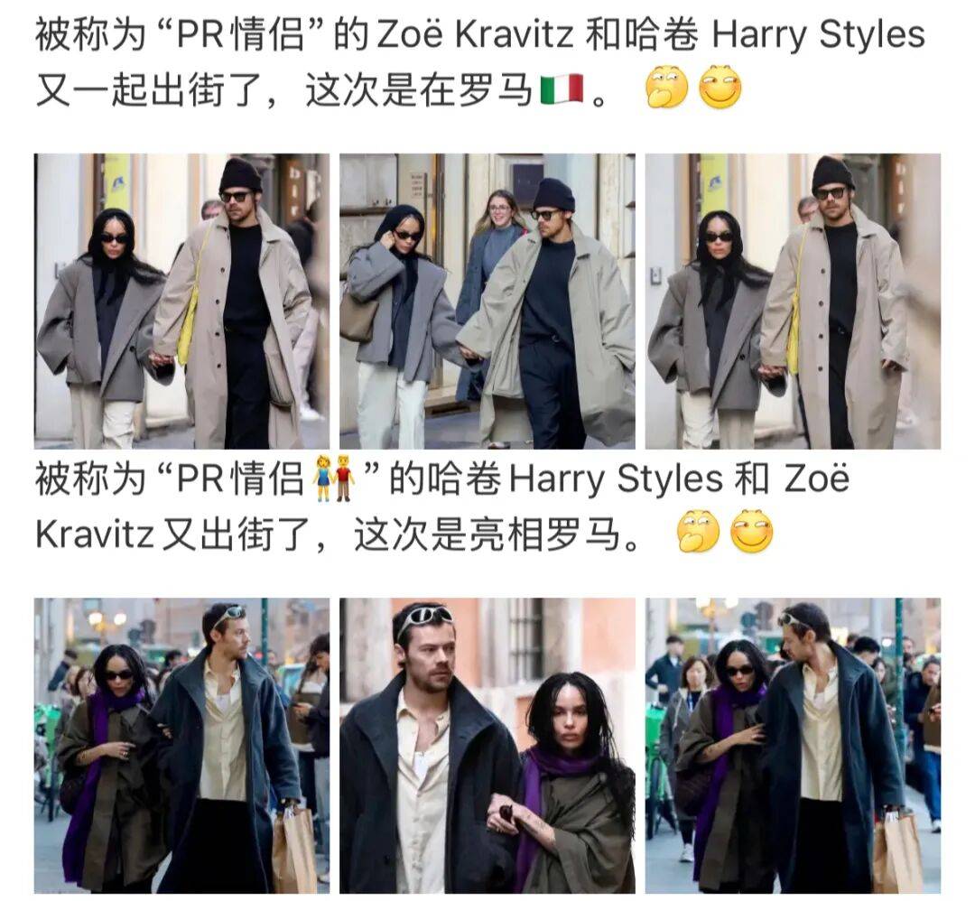 要说当下最受瞩目的“时髦cp”,那非小猫女Zoë Kravitz和哈卷Harry Styles莫属。这俩人仿佛开启了“全球巡逛”模式,频繁被偶遇。前几天,他们又在罗马连续两天被拍,而且风格截然不同,难怪被大家称作“时髦cp”。