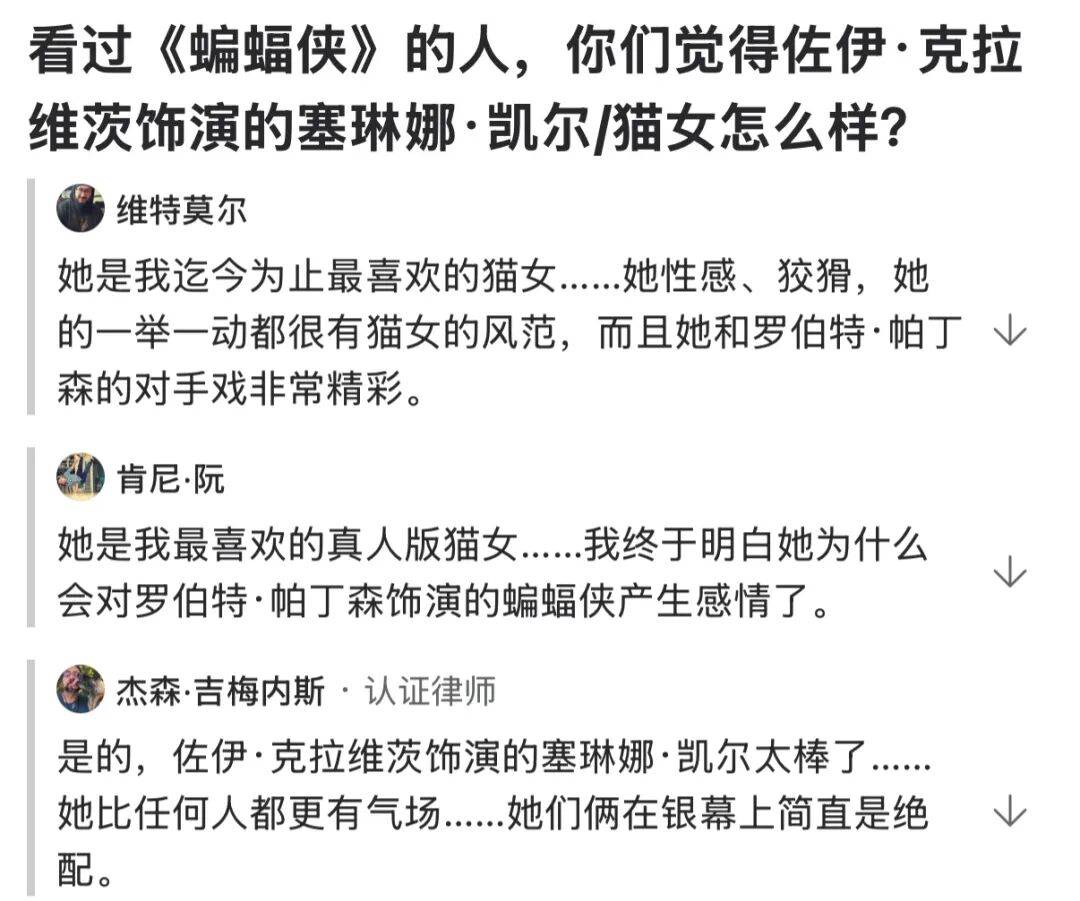 真正让她演艺事业大放光彩的是2022年《新蝙蝠侠》中的“猫女”一角。在Zoë之前,猫女这一角色被很多女星诠释过,安妮·海瑟薇版更是被誉为最惊艳的猫女,《名利场》评价她是有史以来最好的“Catwoman”,官宣Zoë将出演新版猫女后,评论都不太看好。但Zoë没有退缩,虽然坦言很紧张,但一直在刻苦准备。她认真学习揣摩猫咪的习性和心理,对人物的理解也非常深入。她的演绎并非模仿前辈,而是赋予了猫女一种前所未有的神秘和性感,打戏也十分带感。还有人把她跟动漫做对比,称赞她的还原度。在社交媒体上,她的口碑也不错,很多人说她是自己最喜欢的一版猫女,还被《时代》杂志评为当年最具影响力的100位人物之一,可谓“一炮而红”。