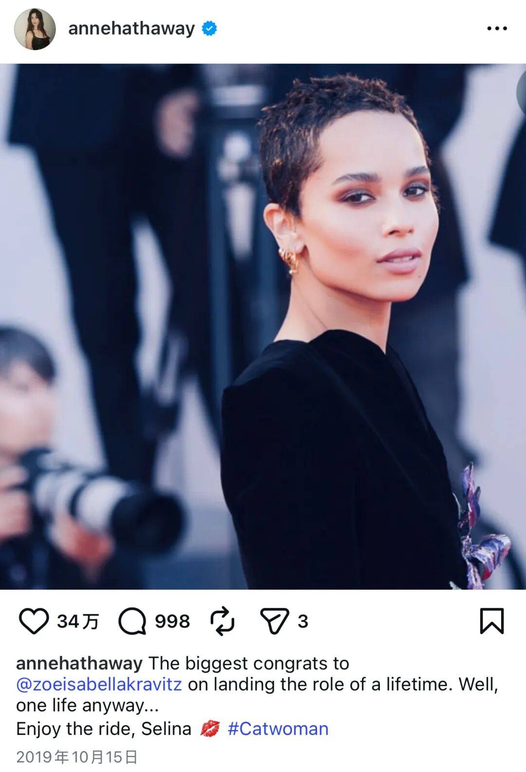 在官宣zoe将出演新版猫女后,安妮还发文祝福过👇
