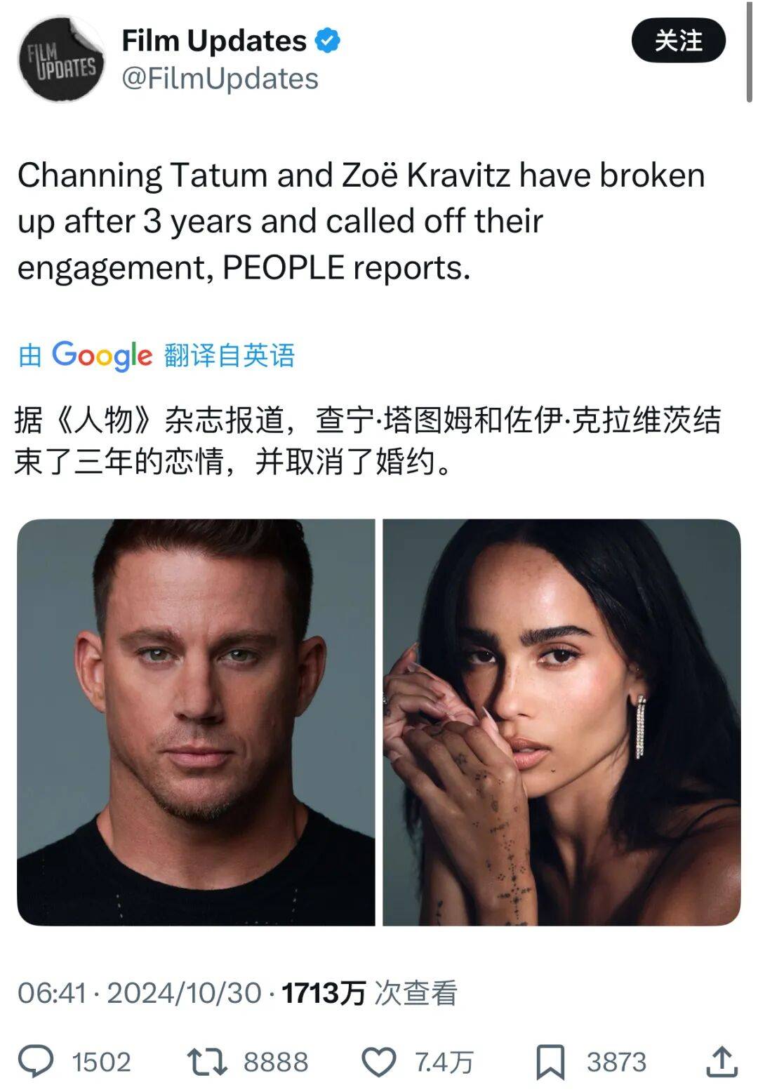 离婚后,Zoë交往的对象是“全世界最性感的男人”“钱老板”Channing Tatum,二人因Zoë执导的电影《眨眼之间》结缘,2021年8月被拍到在一起约会,2023年订婚。“钱老板”很爱她,不仅关注了Zoë的大粉,还在ins上秀恩爱,称呼她为“little sweet”,二人恋爱期间贡献了一系列出圈的街拍照。本以为这次会“终成眷属”,谁知去年10月突然官宣分手。随后,Zoë和油王Austin Butle传出绯闻,当时二人在《偷天盗日》里饰演情侣,被曝出在片场接吻(并不清楚是否是剧情),路透也是各种眼神拉丝,今年7月还被拍到一起去看演出。不过令人没想到的是,最终确定的恋情对象竟然是哈卷。