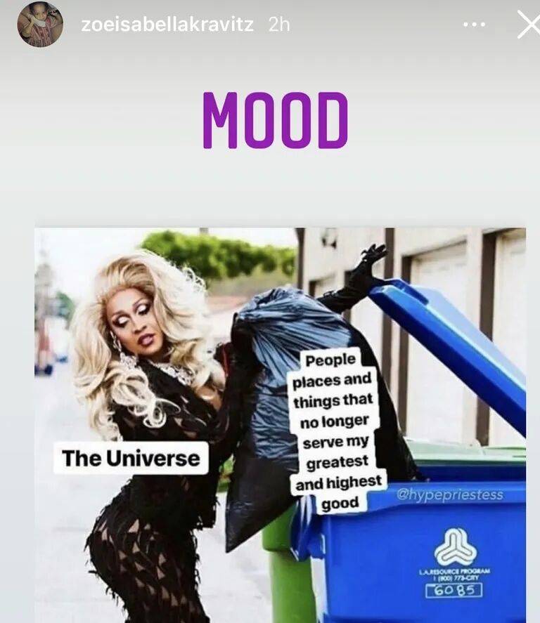 19年,Zoë和演员Karl Glusman结婚,Karl Glusman主演的作品并不多,比较出名的作品是主演了加斯帕·诺的大 尺度电影《爱恋》,今年还和恐怖片女神Samara Weaving合作了《极速女神》,但没什么水花。他们的婚姻仅仅维持了18个月,离婚的时候Zoë还贴出一张扔垃圾的照片,疑似内涵。