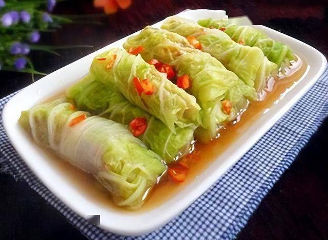 4. 将白菜叶铺平,放入三丝卷成卷,整齐地码在盘子里;