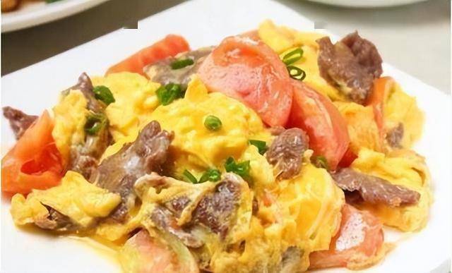 2.将腌制好的牛肉放入蛋液中拌匀,锅烧至十分热,放入油,放入蛋液,用中火拌炒至蛋凝固,撒入葱粒拌匀,即可出锅装盘。