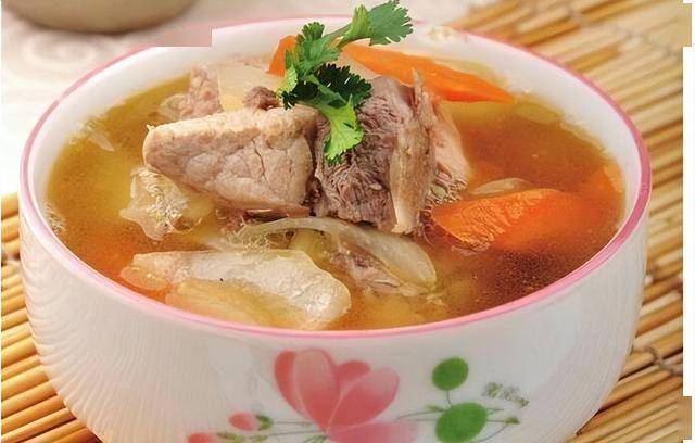 4、加入水、胡萝卜,调入精盐、胡椒粉煲至成熟,调入鸡精、香油,盛在碗内即可。