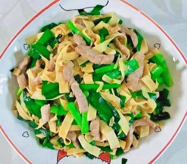 2、豆皮切丝用开水烫一下去腥味,韭菜择洗干净切段,葱切丝