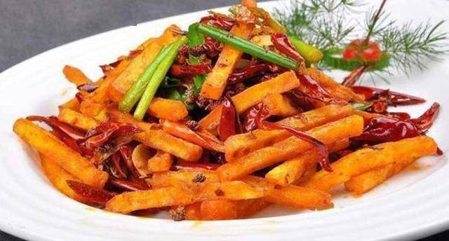 3、煸炒至无水分,表皮金黄,一层壳,土豆就熟了,盛出备用。