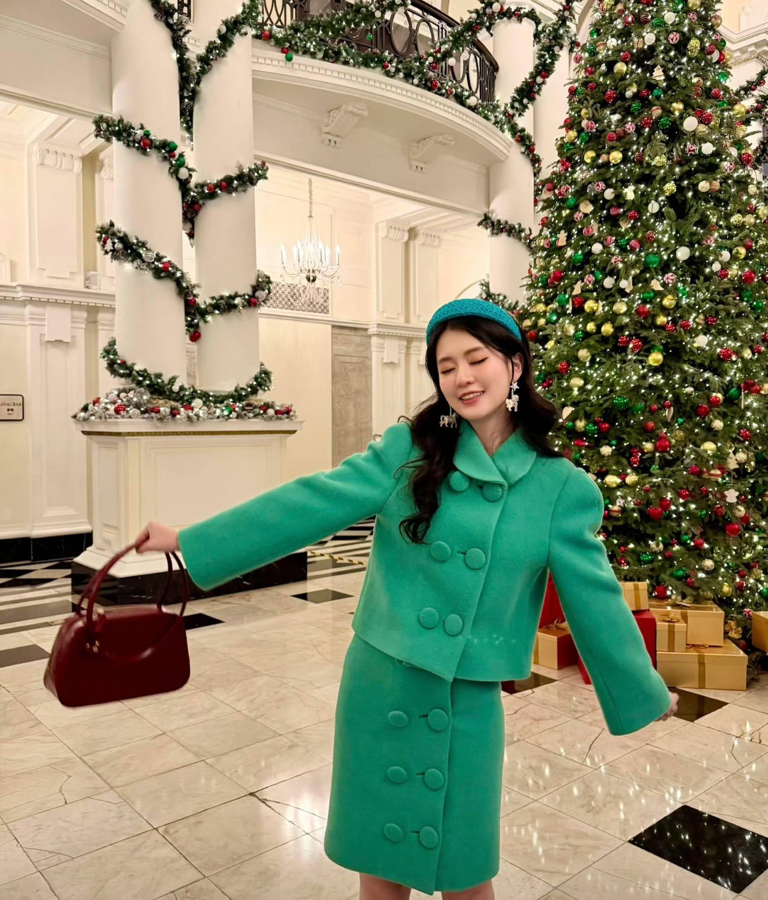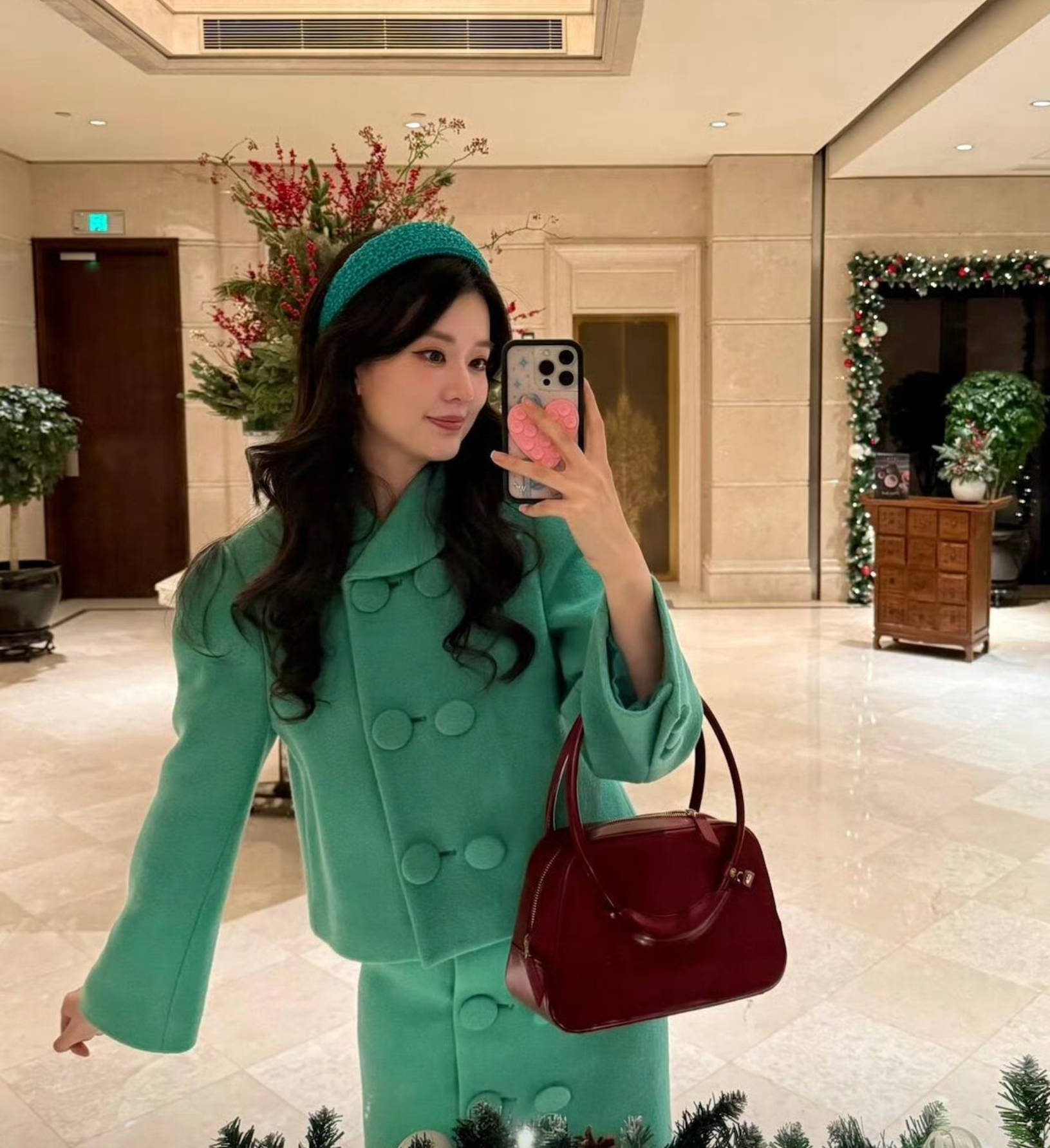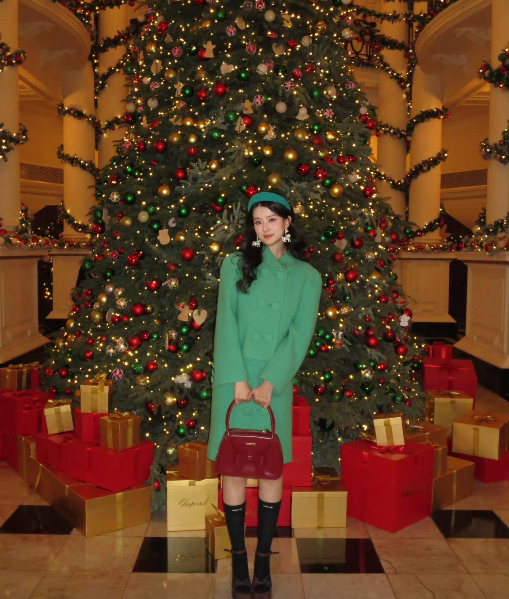 平安夜的社交平台,被乔欣一组红绿撞色穿搭照刷了屏。别人的圣诞配色还在玩红配绿的土味套路,她直接穿一身低饱和度复古绿毛呢套装,拎着一只酒红色手提包,用利落剪裁和高级面料把经典撞色玩出了“亮眼不俗气”的新高度,再配上蓝色发箍点缀,复古优雅的氛围感直接拉满。背景里那棵3米高的圣诞树,还被眼尖的网友扒出是上海华尔道夫酒店的同款,这波“把圣诞氛围穿成自我表达”的操作,直接让穿搭圈掀起了一波模仿潮。