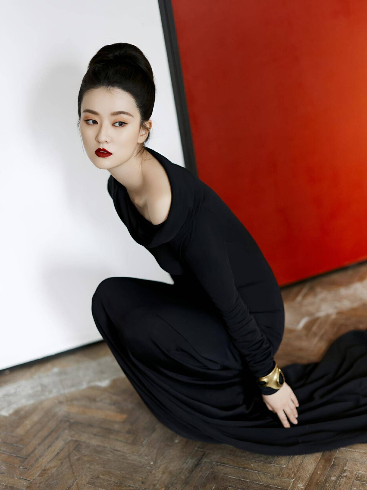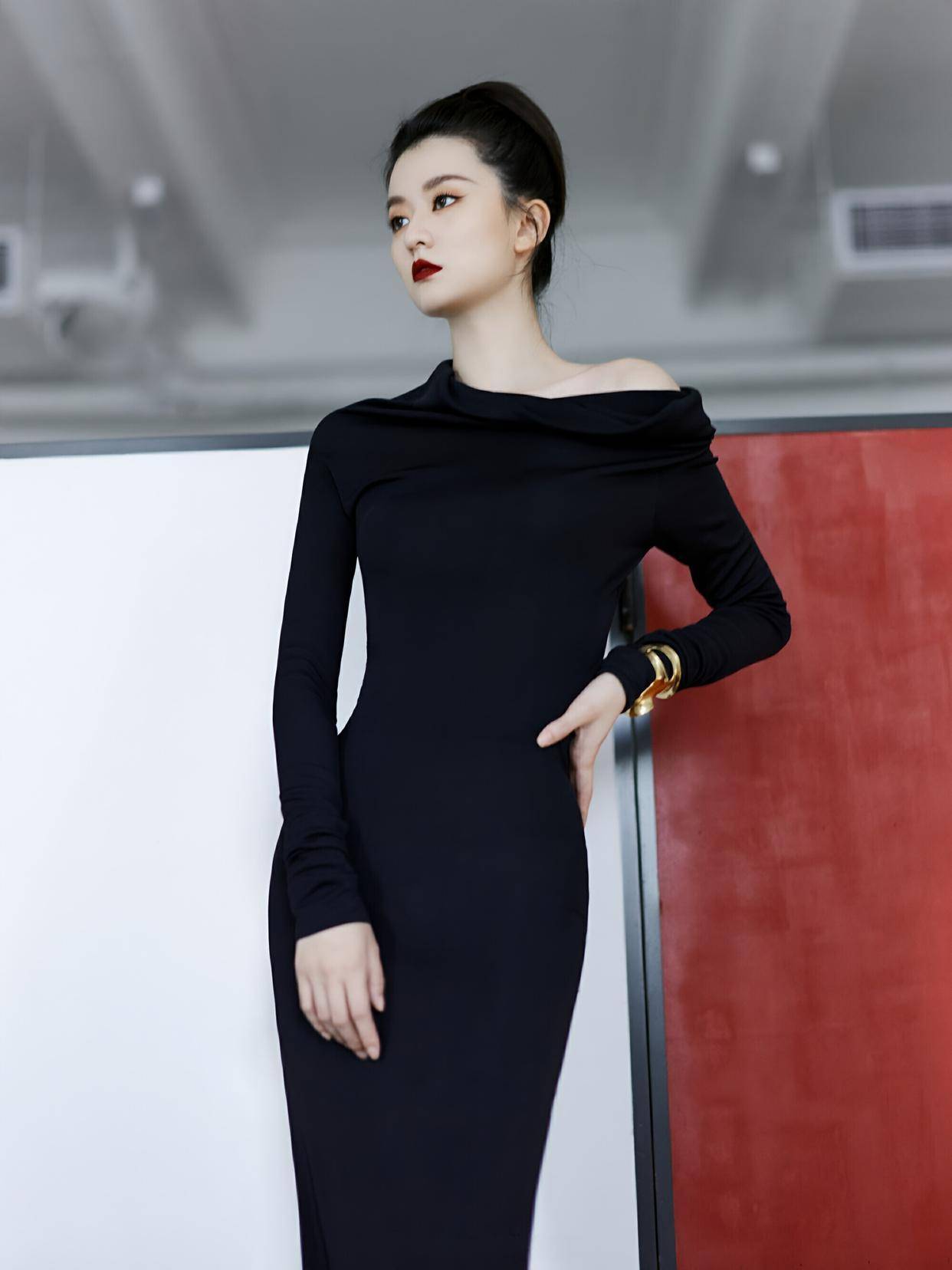 乔欣这套全黑 look,直接被她的气质拿捏 —— 垂坠感满分的黑色修身长裙,露肩设计刚好勾勒出肩颈线条,搭配利落的高丸子头,冷艳里又带着点松弛感,这 “纸片人 + 骨感美” 的适配度简直 YYDS。尤其是裙摆自然垂落的弧度,把她本身优越的身高优势衬得更明显,往那儿一站就是行走的时尚画报。