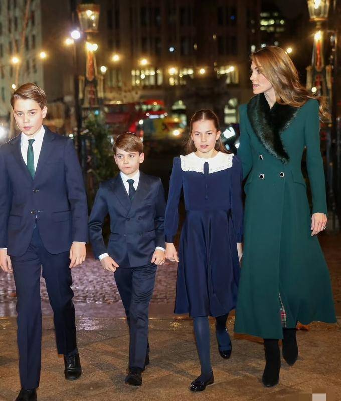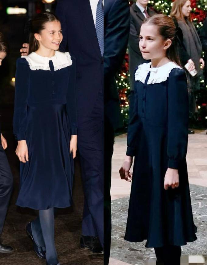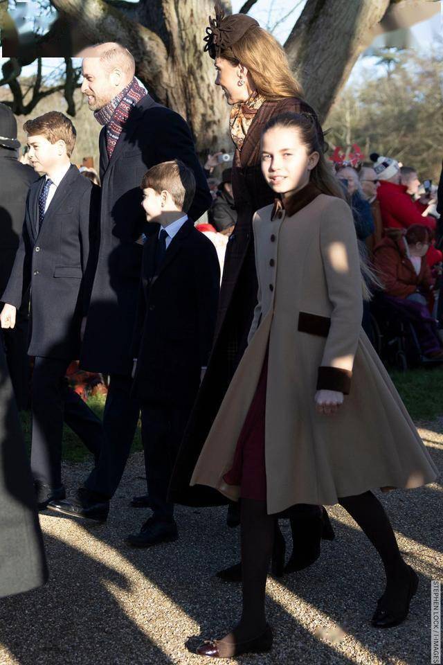 年仅10岁的夏洛特已开始履行王室公务,如圣诞音乐会表演、教堂步行等。她的着装选择(如藏蓝色毛衫配格纹裙)既保留童真,又通过细节(娃娃领、四六分比例)展现王室成员的得体感。这种“小大人”形象与乔治王子的稳重、路易王子的活泼形成互补,共同构建了威尔士三宝的差异化公众形象。