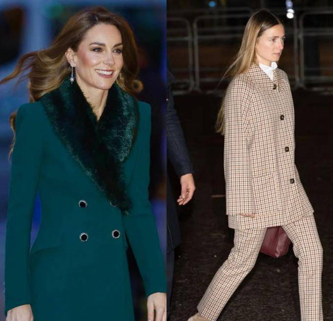 威尔士王妃身着 Blazé Milano 品牌的棕色格纹外套,容光焕发 —— 这件外套是她 2021 年同一场节日活动中首次亮相的款式。