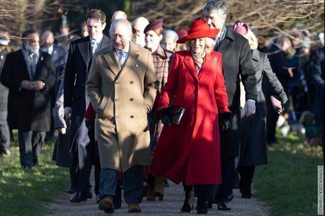 在这个阳光明媚但寒风凛冽的上午,现年78岁的卡米拉身穿喜庆的红色大衣,头戴时尚的帽子,与面带微笑的查尔斯国王并肩而行 ,带领着王室成员前往教堂。