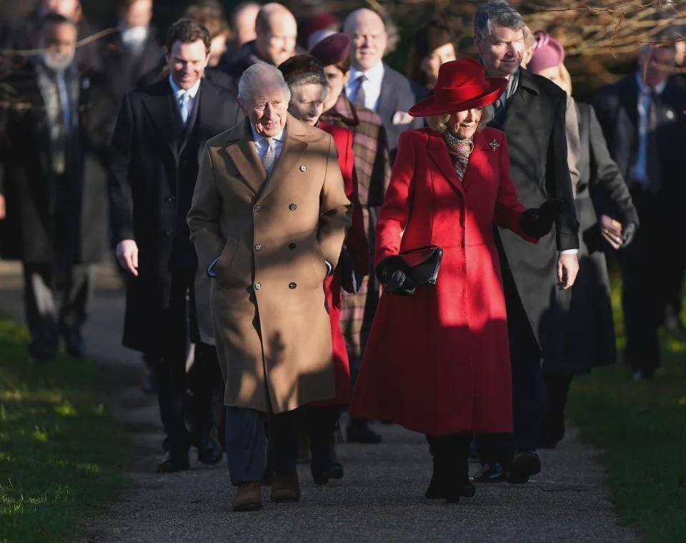 查尔斯国王与卡米拉王后率领众人,王后选择了鲜艳的红色(非常适合圣诞节的颜色),安妮公主也选了相近色调。