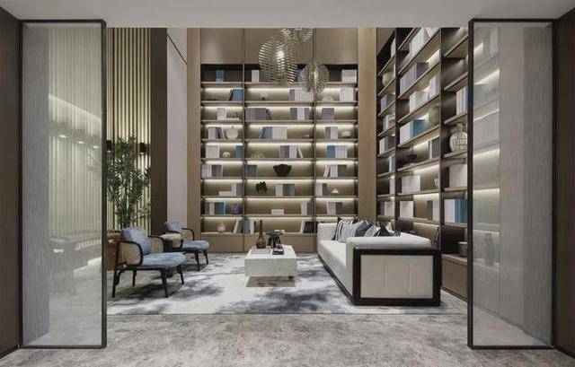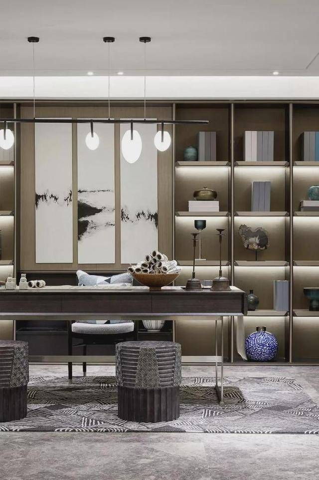 ▲书房在夹层位置,定制上一个L字形的大书架,加入暗藏灯带,摆上书籍与装饰品,显得禅意而高级。