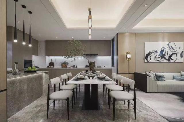 ▲餐厅厨房一体的开放式空间设计,在灰色大理石质感的地面与中岛台烘托下,显得时尚优雅而大气。八人餐桌椅组合,搭配上雅白的石材台面餐桌,布置精致优雅的茶具,让用餐氛围端庄而精致。