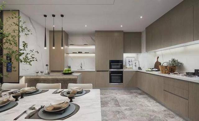 ▲L字形的操作台,装上木质感的定制橱柜,嵌入电器设计,操作台后的墙面是雅白的大理石质感,搭配上一个中岛台的布局,让做饭空间显得轻松优雅而方便大气。
